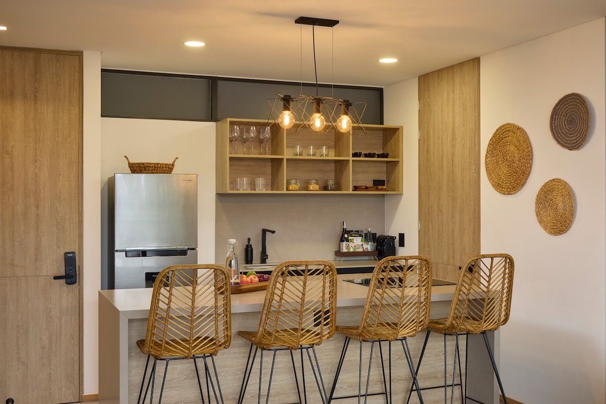 Elegant 104 m² (1,120 ft²) apartment with panoramic views of Medellín. Featuring two bedrooms with King-size beds and private bathrooms, a guest bathroom, air conditioning, and a spacious private terrace. The building offers an infinity pool, coworking space, gym, and a fully equipped kitchen for gastronomic experiences. Located just 9 minutes from El Poblado, Provenza, and Parque Lleras. ✨ A space where design meets comfort, and Medellín becomes your private stage.