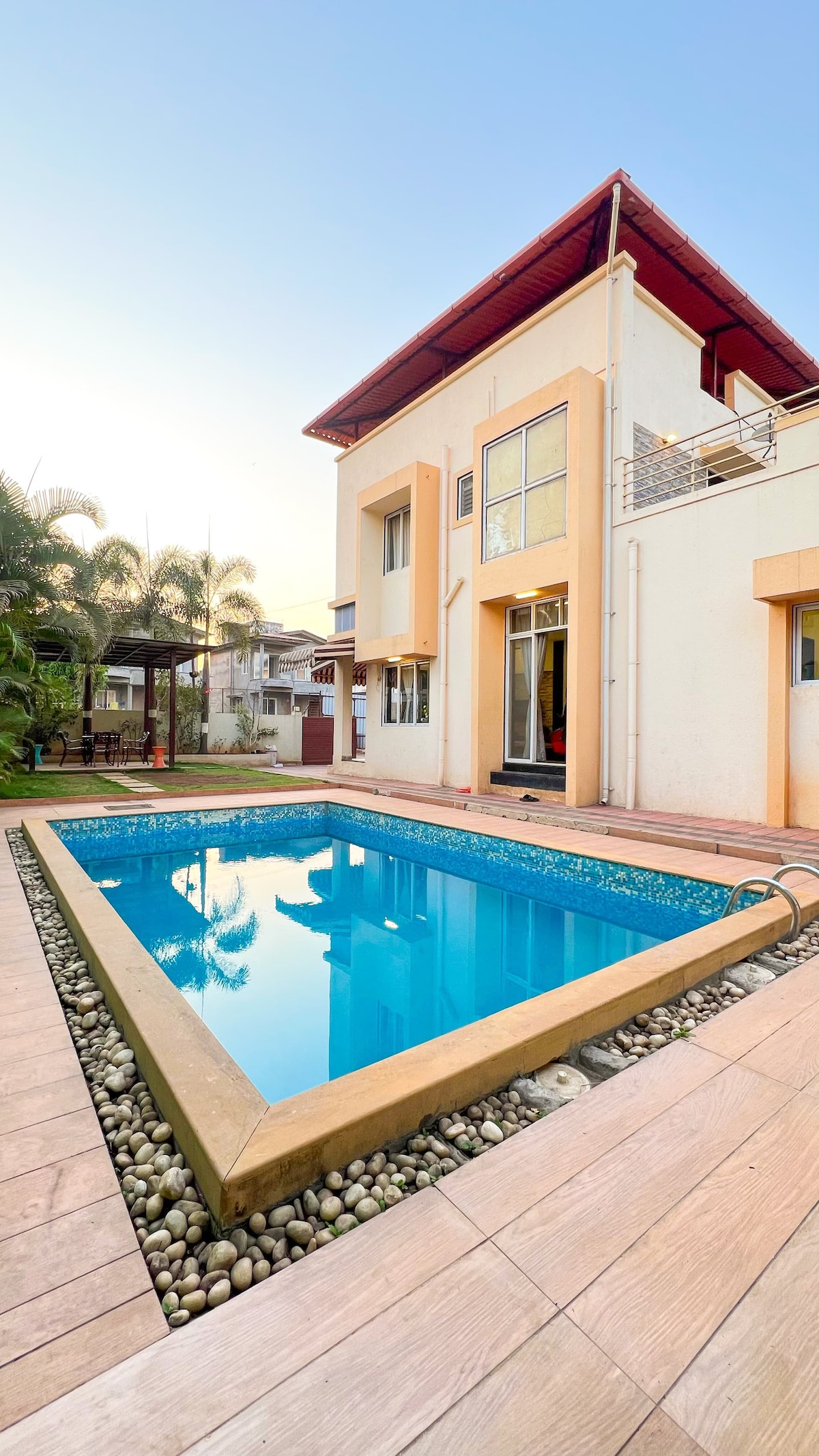 Experience comfort and style in this modern 5BHK villa in Lonavala, perfect for families and groups. The villa features a private swimming pool, sunset-view terrace, gazebo, and a spacious lawn ideal for relaxing and spending quality time together. Designed with a warm and cozy ambiance, the interiors are spacious and inviting. Centrally located, the villa offers easy access to all major attractions, markets, and conveniences, ensuring a comfortable and hassle-free stay.