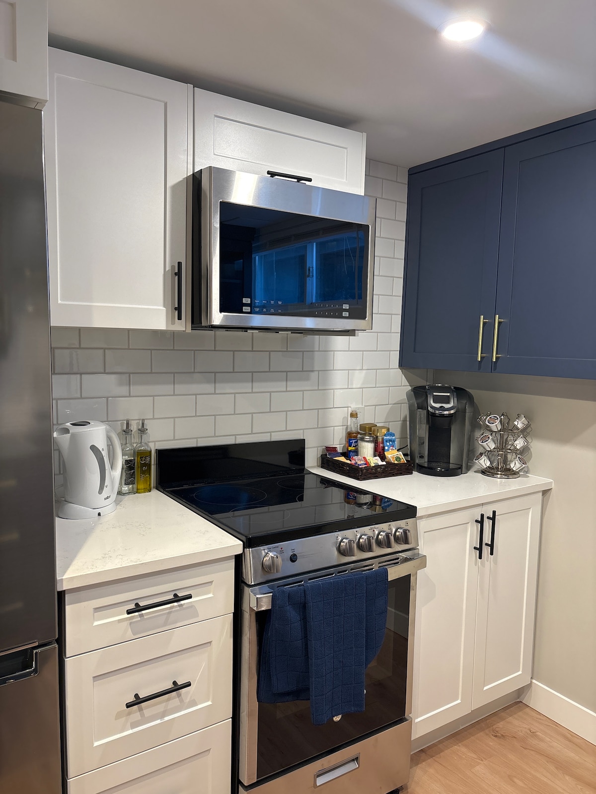 We've recently renovated our basement to create a stylish, modern, cozy and quiet guest suite. There is a side entrance that opens directly onto stairs taking you down to the unit. It has a locking metal exterior door for sound-proofing and security. The unit is a bright studio apartment with three large windows, a full kitchen, sitting area with tv and fireplace, dining table, queen-sized bed, walk-in closet and your own private bathroom with a five-foot shower. With extensive sound-proofing!