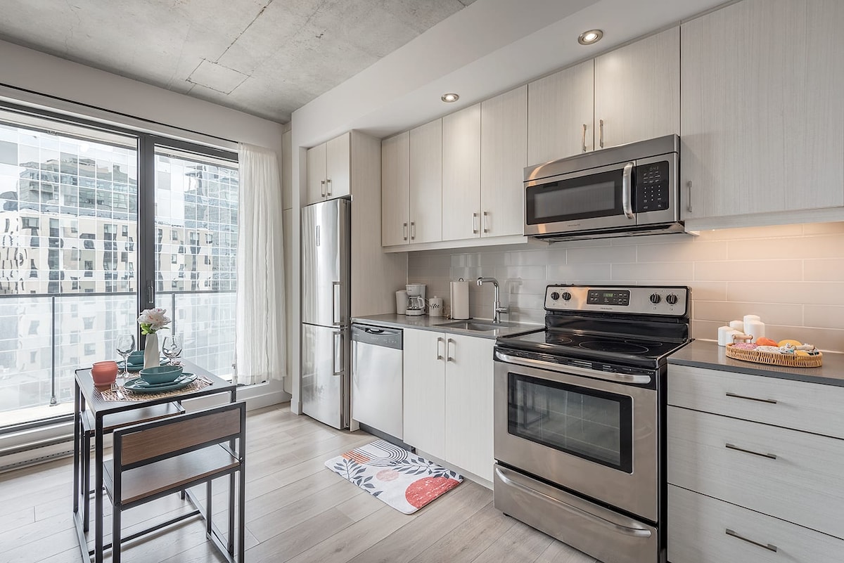 Կոնդոմինիումը գտնվում է քաղաքի կենտրոնում ՝ ուղիղ մուտքով դեպի Bell Center ։ Վայելեք ձեր հանգիստը շքեղությամբ և հարմարավետությամբ ՝ լիովին կահավորված մեկ ննջասենյակով կոնդոմինիումով, որը ներառում է անվճար սուրճ, տոստեր, թեյնիկ և խոհանոցային բոլոր գործիքները: Շոգեբաղնիք, լողավազան, մարզասրահ բազմաթիվ կշիռներով և մեքենաներով, skylounge, խաղային սենյակ, լաունջ և տեռաս ՝ բազմաթիվ մանղալներով: Վայելեք անվճար ստորգետնյա կայանատեղի և 1 րոպե մուտք դեպի մետրոյի համակարգ ՝ առանց դրսում ոտքով քայլելու: Netflix - ը ներառված է