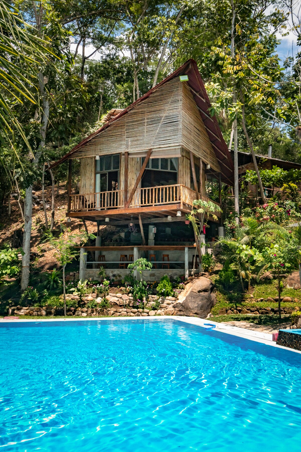 Գեղեցիկ տուն, որն ամբողջությամբ պատրաստված է բնական նյութերից ՝ սահող բլրի վրա, որը նայում է ջունգլիների փոքրիկ ծովածոցին: WI - FI.. 220V ..գարնանային մատրաս Կարճ ոտքով հեռավորության վրա մուտք դեպի ցնցուղարան և լոգասենյակ : Համօգտագործվող ցուրտ տարածք: Մարզասրահ: Մալոկա ՝ փակ կրակակետով: Տեռաս ՝ 9000 լ լողավազանով (բնական տերևներ և ջրիմուռներ) Գտնվում է քաղաքից դուրս ՝ ջունգլիներում ։ Մուտք դեպի քաղաք ոտքով կամ մոտոտաքսի 10 րոպե Այստեղ ՝ բնական միջավայրում, կարող եք տեսնել կապիկների սարդերի և ջունգլիների այլ արարածների