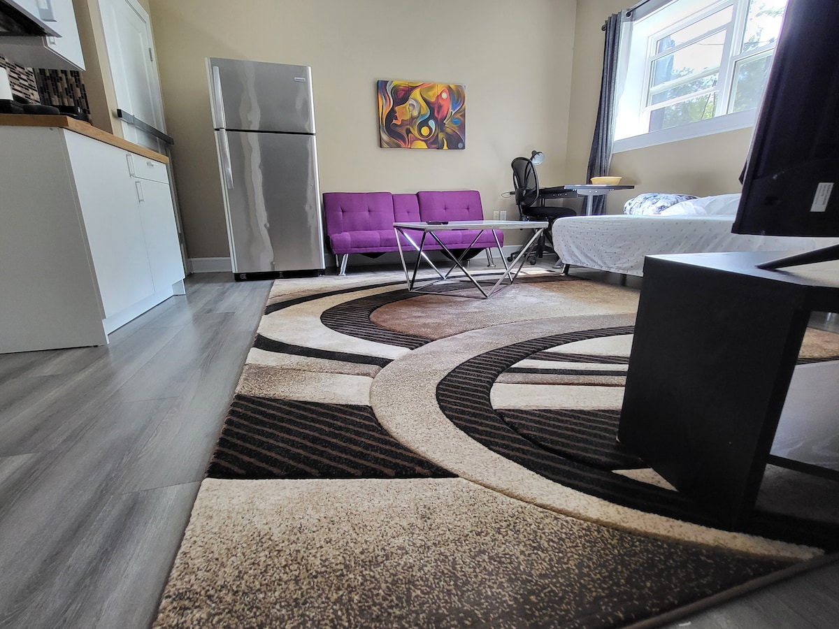 Experience comfortable and spacious bedroom/bathroom and living room. Enjoy morning coffee on our bistro set. All kitchenette items like microwave, electric kettle, fridge, toaster coffee maker, and crockery are included. Have a glass of wine on your own bar counter or enjoy netflix on the large comfy sectional after exploring the scenic beauty of maritime. Free street parking is available. Bus stop is right at the doorstep. 5 min drive to Sobeys, Superstore, NSLC, restaurants, and bars.