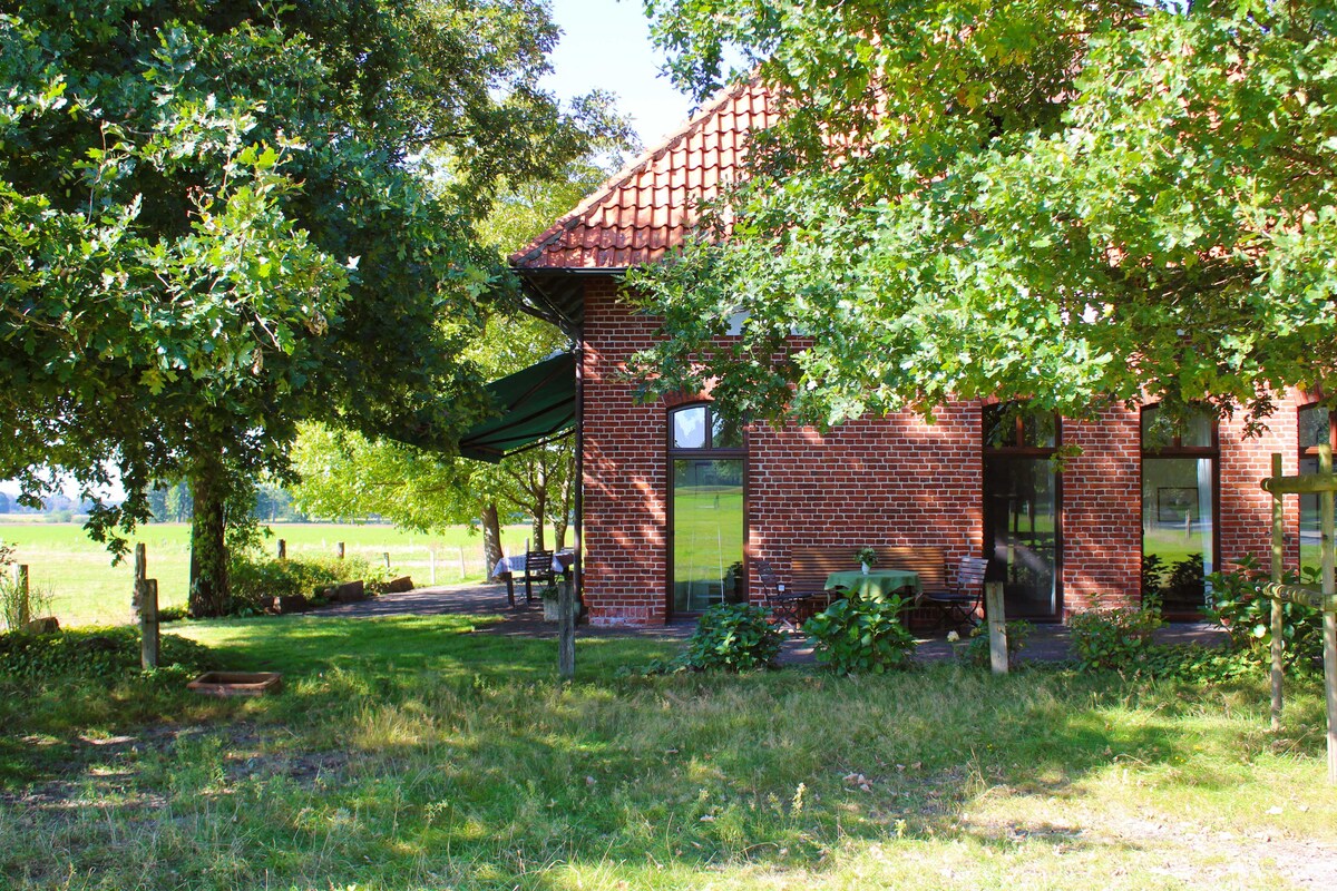 When you are looking for a real quiet and relaxing resort, sou will love to live in our wonderful old barn house neatly renovated from an architect loving old houses and modern technique (that is me). You can enjoy a real large TV, (incl. BluRay-Player etc.) Internet and a cosy fire place. Dive into nature below old oak and ash trees, wake up with happy bird chirp and watch hare, pheasants and deer walk by the huge glass doors in front of the kitchen and living room.
