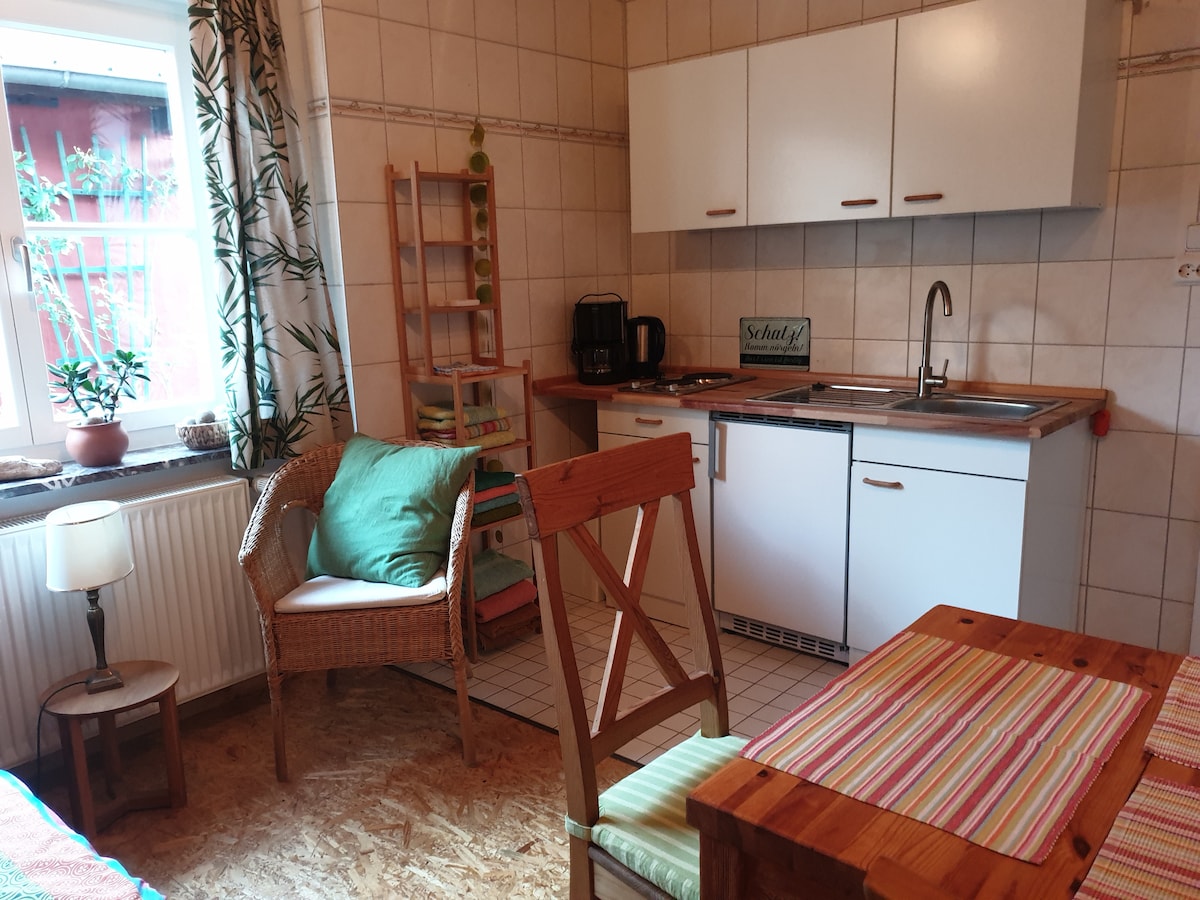 Gemütliche Ferienwohnung (ca. 75 bzw. 90 m²) in denkmalgeschütztem Fachwerkhaus. Großzügige, voll ausgestattete Küche mit Kachelofen, Wohnzimmer mit Schlafcouch, Leseecke und Kachelofen, 1 Schlafzimmer (1-2 Personen) oder 2 Schlafzimmer (ab 3 Personen), jeweils mit Doppelbett, Badezimmer mit Dusche und Sauna. WLAN in der ganzen Wohnung mit kostenlosem Internetzugang. Zentralheizung in allen Zimmern. Eigener Garten. Gegen Aufpreis verfügbar: Transfer v.Bhf,Einkaufservice,Leihfahrräder, Kanus,Gym