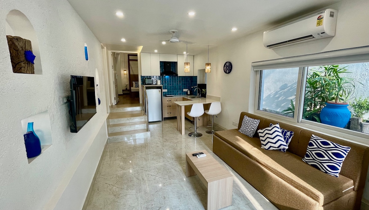 ♂Բարի գալուստ մեր հմայիչ «Սանտորինի ոճի 1BHK» բնակարան, որը ոգեշնչված է հունական ճարտարապետությամբ և ժամանակակից հարմարավետությամբ։ Կանաչապատ տարածքով շրջապատված խաղաղ վայրում գտնվող այս գեղեցիկ դիզայնով հյուրերի առանձնաբաժնում կա 1 ննջասենյակ, ընդարձակ հյուրասենյակ և լիովին բեռնված խոհանոց ։ Սպիտակ պատերը, կապույտ շեշտադրումները և յուրահատուկ դիզայնը ստեղծում են հանգիստ մթնոլորտ, որը հարմար է հանգստի համար: Այս յուրահատուկ վայրը մոտ է ամեն ինչի, ինչը հեշտացնում է ձեր այցի պլանավորումը ։