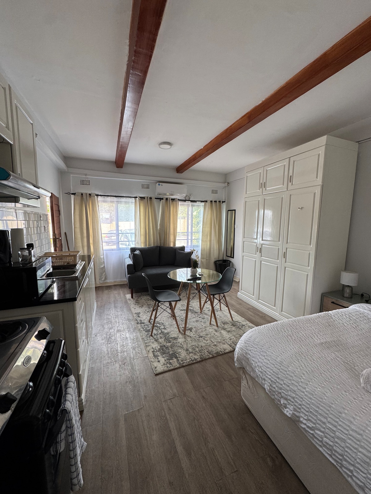 Էլեգանտ ստուդիայի բնակարանը գտնվում է ամերիկյան դեսպանատնից մոտ 1.4կմ հեռավորության վրա գտնվող գեղեցիկ անշարժ գույքի տարածքում: Բնակարանը հագեցած է արևային պահուստային էներգիայով ՝ բեռների թափման դեմ պայքարելու համար, գազի կաթսա, Aircon, լվացքի մեքենա, Netflix, WI - FI և պատշգամբ ՝ մասնավոր տեսարանով, ինչը այն իդեալական է դարձնում ինչպես գործնական, այնպես էլ ժամանցային ուղևորների համար ։ Անշարժ գույքը հսկվում է, ունի 24 ժամյա անվտանգություն, Clubhouse, Braai - ama, Pool, Gym, Kids Jungle - jm, CCTV: Մոտավորապես 7 րոպե ճանապարհ է դեպի Քաբուլոնգա Կենտրո մոլ և 3 այլ մոլեր: