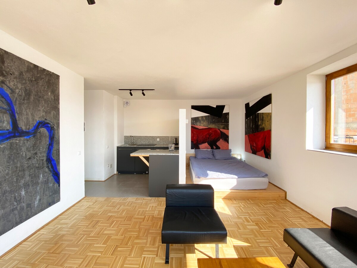 The apartment is in the pedestrian area of Old Prizren. This unique accommodation is close to all sites and amenities. Second of three apartments, Nr2, is on the first floor, ideal for a couple or two friends. The Studio Nr2 has a large living room-kitchen area and a bedroom that is open but hidden by the kitchen wall. A small terrace allows you to sit outside. The Studio looks West and North with a beautiful view of the city and the Kalaja the fortress of Prizren.