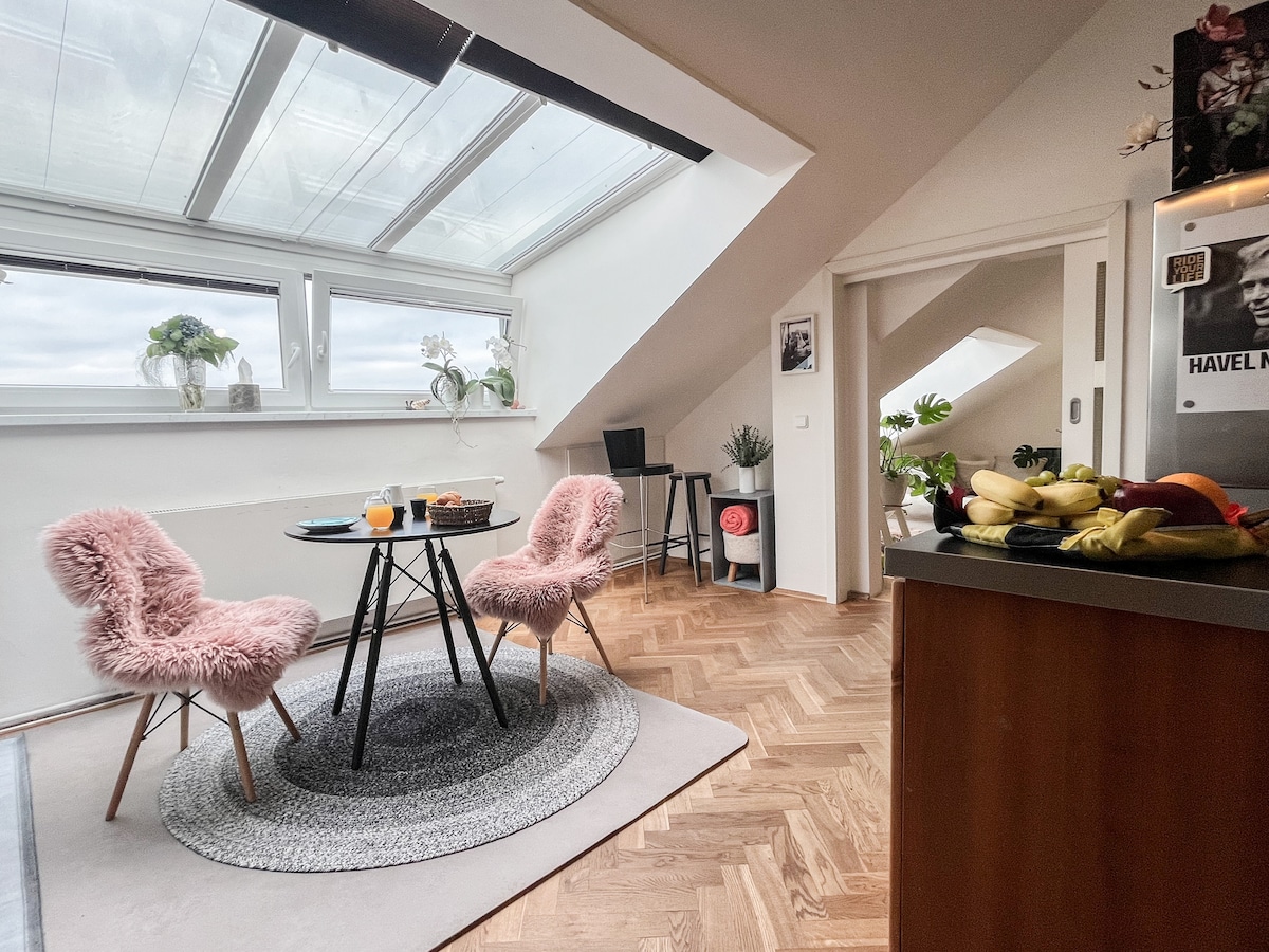 Պենտհաուս բնակարան Պրահայի բնակելի տարածքում ՝ պատմական կենտրոնից քար նետելով ։ Բնակարանում կան լիակատար հարմարություններ, այդ թվում ՝ շքեղ խոհանոց, լոգասենյակ ՝ լոգասենյակով և առանձին ցնցուղ, 2 մեծ երկտեղանի զսպանակով մահճակալ և մեծ արևային տեռաս ։ Բնակարանը խնամքով ձևավորվել է ՝ արտացոլելով սեփականատիրոջ սերը արվեստի և դիզայնի նկատմամբ ։ Օդանավակայանից 20 րոպե հեռավորության վրա, շենքի դիմաց վճարովի կայանատեղի և պատմական կենտրոնից 300 մետր հեռավորության վրա ։ Կարճ ասած ՝ երազանքի բնակարան ։