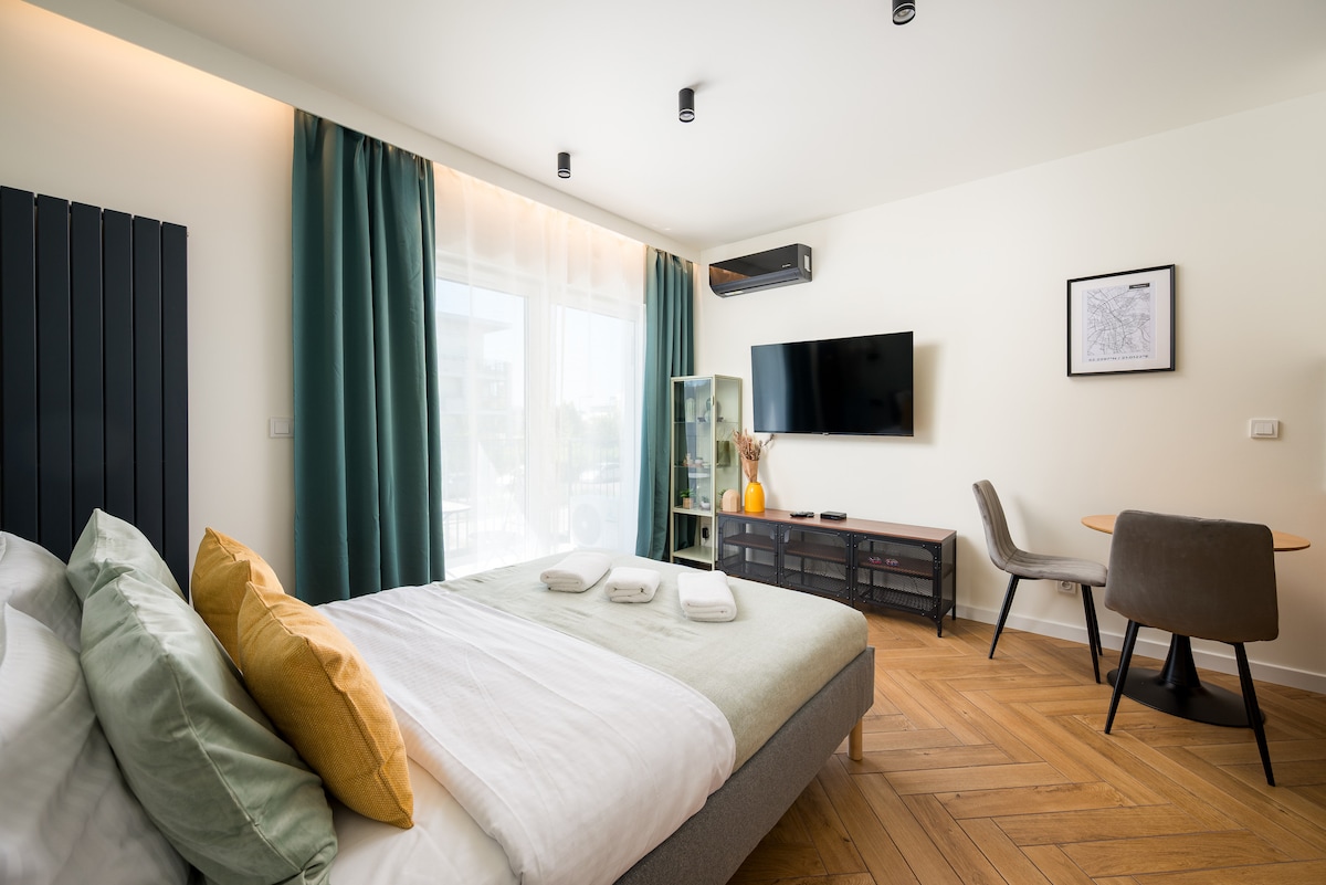 Հարմարավետ, լիովին կահավորված բնակարան նոր շենքում ։ Հյուրասենյակ ՝ բաց խոհանոցով, որը բաժանված է ճաշասենյակի և նստատեղի ։ Ննջասենյակում կա մեծ մահճակալ և ընդարձակ զգեստապահարան: Կա նաև ներս մտնող պահարան ՝ որպես լրացուցիչ պահեստային տարածք ։ Մոտակայքում կան խանութներ, ռեստորաններ և սրճարաններ Սարքավորումներ ՝ օդորակիչ, էսպրեսո մեքենա, թեյնիկ, արդուկ, արդուկի սեղան, լվացքի մեքենա Ուղևորություն Շոպենի օդանավակայանից 20 րոպե տևողությամբ տաքսի 50 րոպե շփում մոդլինի օդանավակայանից 50 րոպե տևողությամբ տաքսի 120 րոպե տևողությամբ շփում