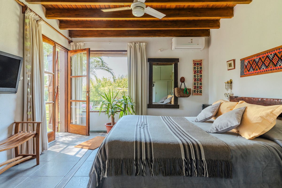 A unique place. A space to fully experience. 13 km from the city of Mendoza and within the "Wine Roads" circuit. With a private exit, exclusive covered garage, excellent Wi-Fi, a queen-size bed, en suite bathroom, TV, refrigerator, electric oven, microwave, electric kettle, bed and bath linens, and pool towels. We also include a split-screen TV and a safe. We continue to add comfort and tranquility to make your stay in our space unforgettable.