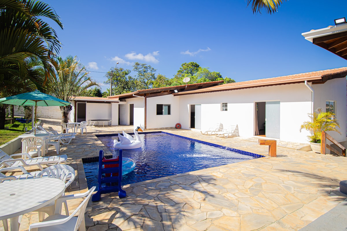 Գյուղական տուն ՝ լիարժեք հանգիստ մեծահասակների և երեխաների համար Սան Պաուլուից (մայրաքաղաք) 50 րոպե հեռավորության վրա ։ Ընդարձակ և հարմարավետ տուն մինչև 15 հոգու համար, 6 առանձնաբաժին և պատշգամբ ։ Եթե անհրաժեշտ է տեղավորել 17 հոգու, ԴԻՄԵՔ մեզ ։ Ընդարձակ, հարմարավետ գուրմանական տարածք ՝ սառնարանով, գարեջրով, մանղալով և փայտե պիցցայի ջեռոցով ։ Իդեալական է վայելել ընտանիքի և ընկերների հետ ամռանը ՝ վայելելով լողավազանը կամ ձմռանը ՝ վայելելով բուխարիները: