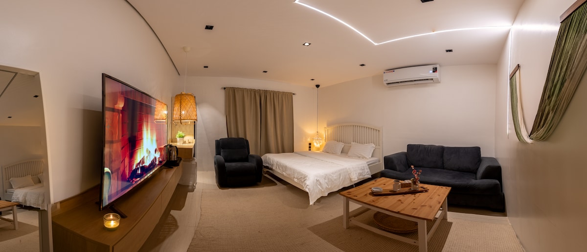 استوديو واسع وهادئ، يتوسطه سرير كبير يمنح شعوراً بالراحة، وبالقرب منه جلسة أنيقة تضم أريكة مريحة وطاولة جانبية بسيطة. المكان منسّق بشكل عملي وواضح، وإضاءته لطيفة تضفي عليه طابعاً دافئاً ومريحاً.. يبعد ١،٩ كم عن مواقف كدي ، أقرب محطة حافلات تبعد ١٠٠ م ، يبعد ٥٠٠ م عن ممشى بطحاء قريش ..
