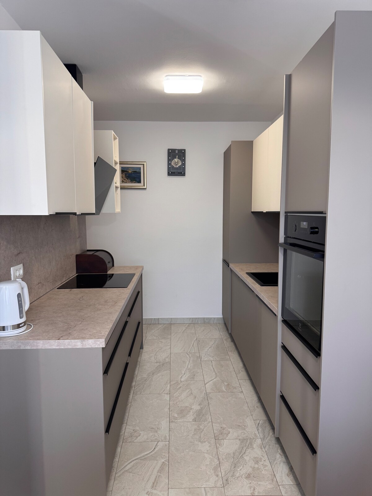 Բնակարանի չափը ՝ 55 մ² - Առաջին հարկի բնակարան ՝ հարթ էկրանով արբանյակային հեռուստացույցով , օդորակիչով և տան ծովի ափին գտնվող կտուրով ։ Բնակարանում կա լիովին կահավորված խոհանոց ՝ սուրճի մեքենայով, թեյնիկով, ամանալվաց մեքենայով ։ Լոգասենյակում կա լոգարան , ցնցուղ, լվացքի մեքենա: Մեկ ննջասենյակ ՝ երկտեղանի մահճակալով, հյուրասենյակ ՝ 2 անձի համար նախատեսված բազմոց - մահճակալով ։ Լողափը (200 մ) - քար, կարելի է հասնել 2 րոպեանոց զբոսանքի ընթացքում, իսկ քաղաքի կենտրոնը 700 մ հեռավորության վրա է (10 րոպե քայլելու համար):