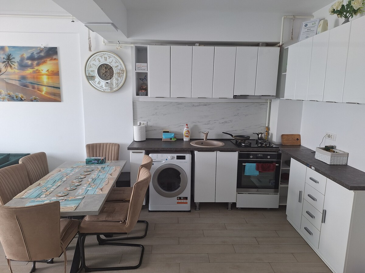 Apartament studio lux, situat la doar 50 de metri de plajă, cu vedere la mare în Navodari Tabără la promenadă. Această locuință de 50 de metri pătrați este modernă și confortabilă. Vă punem la dispoziție un apartament de 2 camere alcătuit dintr-un dormitor cu pat matrimonial și un living open space având o canapea extensibila. Bucataria este mobilată și utilată cu electrocasnice noi de cea mai bună calitate. Proprietatea dispune de locuri de parcare private cu acces bariera.