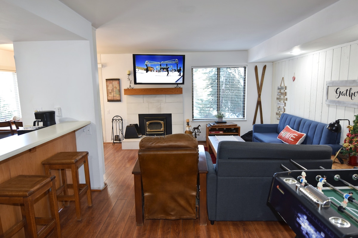 Պայծառ 1BR, տնային կենդանիների համար հարմար, մարգագետնային կոնդոմինիում 6 քնելու տեղ: Նկարները կոնդոմինիումի տեսարաններ են: Ժամանակակից, լիովին կահավորված խոհանոց, վերանորոգված լոգասենյակ և պելետ - վառարանով բուխարի, King Posturepedic մահճակալ, Wi - Fi, 2 բարձրակարգ թագուհու քնելու բազմոցներ (առանց անհարմար աղբյուրների/բարերի), 50" և 32" Smart հեռուստացույցներ և Xbox One: Անկյուն, վերգետնյա հարկաբաժին, ընդամենը մի քանի քայլ դեպի շքամուտք ։ Դահուկներով սահելու, ավտոբուսի, այգու, հեծանվային ուղու, շների զբոսանքի, ճաշելու, ձկնորսության և գոլֆի դաշտերի մոտ: Տնային կենդանի բերելու դեպքում պահանջվում է 69 $ տնային կենդանու ՎՃԱՐ ։
