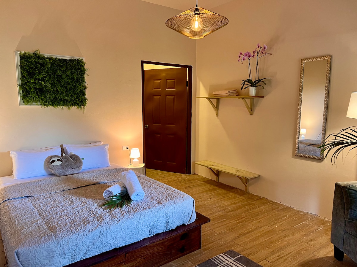 Enjoy a spacious room with a luxurious king bed, a cozy lounge chair, free homemade breakfast, and a free guided park tour (tickets not included). Start your day with a fresh Costa Rican–style breakfast and enjoy the convenience of private parking. Step onto the shared balcony, where monkeys and colorful macaws visit daily. And for the ultimate relaxation, treat yourself to one of our in-room massages during your stay.