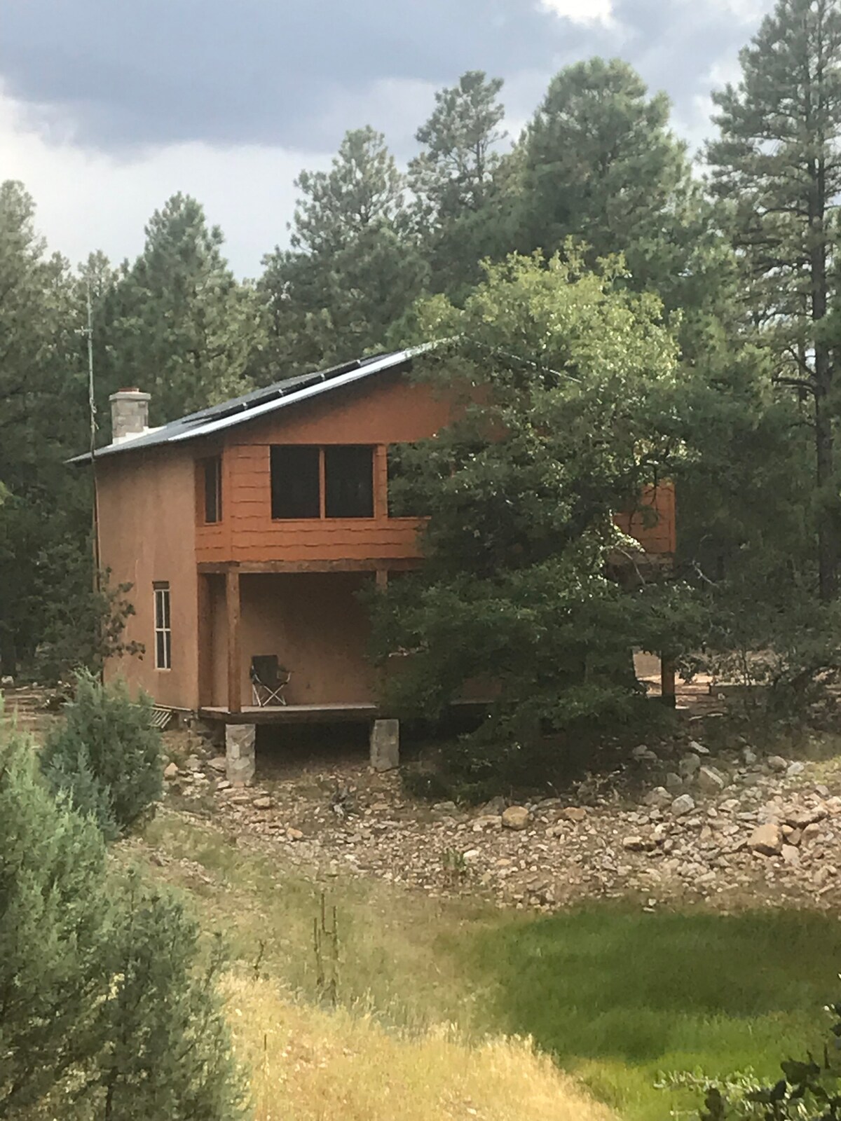 Վերջերս կառուցված այս լեռնային տնակը գտնվում է մասնավոր հողատարածքում ՝ Կիբոլա ազգային անտառի խորքում, և 13 մղոն դեպի հյուսիս - արևմուտք ՝ Mountainair - ից ։ Այն ցանցից դուրս է ՝ ժամանակակից արևային համակարգով: Այս երկու պատմությունների տունն ունի մեծ ցուցադրված շքապատշգամբ, որտեղից բացվում է վայրի բնության ջրող լճակի տեսարան, այնպես որ բերեք ձեր տեսախցիկը ։ Այս չքնաղ տունը շատ հարմարավետ է և բավականին մեկուսացված: Եթե ձեր արշավորդը ձեր բախտին է: Մանզանոսի լեռներն ունեն շատ գեղեցիկ արշավային արահետներ: