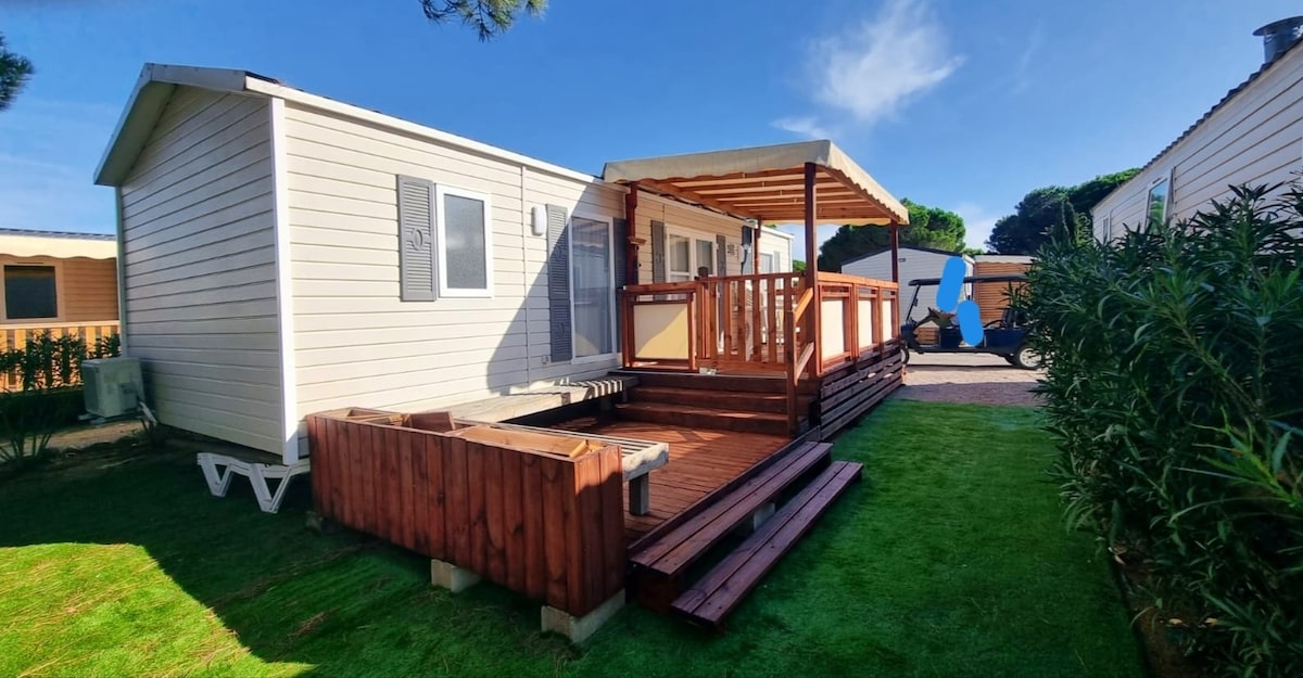 32 մ2 մակերեսով նոր շարժական տուն (2023 )՝ 16 մ2 մակերեսով ծածկված կտուրով, հանգիստ և ստվերաներկված հողամասով ։ Հարմարություններ ՝ այցը հեշտացնելու համար ։ Հյուրասենյակ, ճաշասենյակ, կահավորված խոհանոց, խելացի հարթ էկրանով հեռուստացույց ։ Քնում է 4 -6 հոգի Մեր Mobil Home - ը գտնվում է բարձրակարգ քեմփինգի սրտում, որը գտնվում է ծովի և լճակի միջև ՝ ջրային համալիր, ֆիթնես սենյակ, խանութներ, ժամանց... ՝ դեպի լողափ անմիջական ելքով «Լինելու վայրը »՝ հանգստի անմոռանալի պահեր վայելելու համար ։