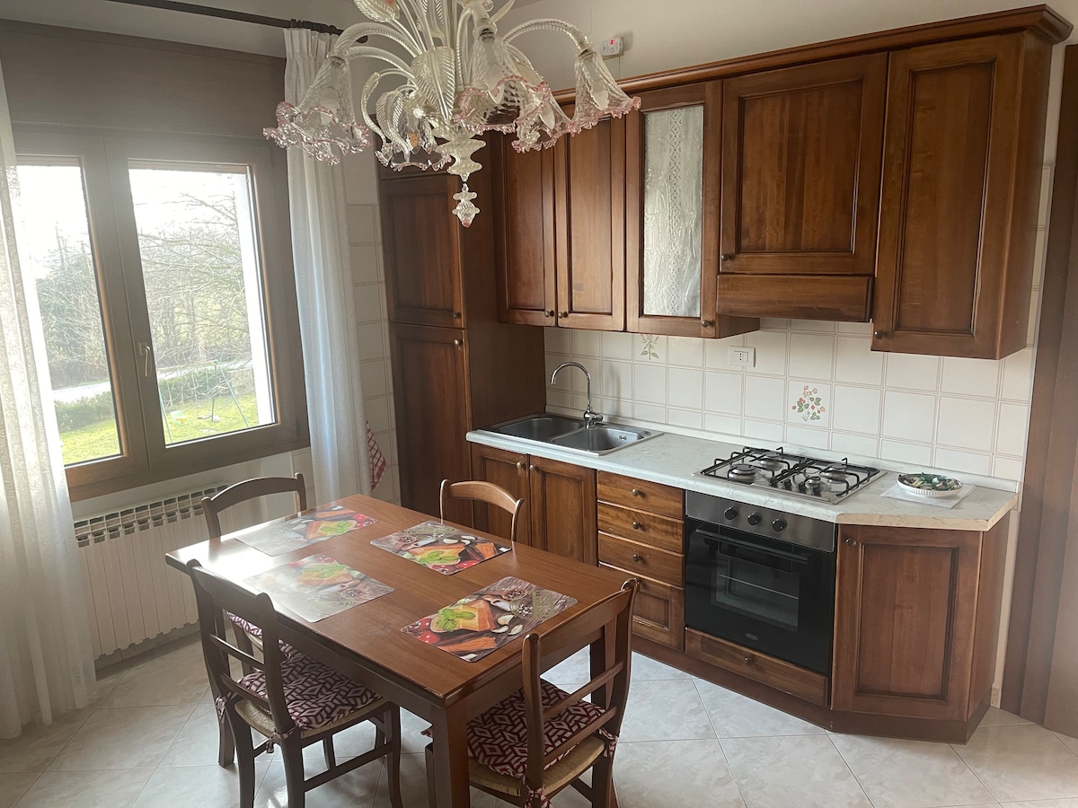 The apartment is located on the ground floor with independent entrance inside a property completely fenced and under video surveillance, free park. Large fully equipped kitchen, small living room, bedroom with double bed and single bed, bathroom with washing machine, AC,free internal parking, 15 min. Car / 20 min. Bus from Venice. Residential area surrounded by greenery, very quiet, shops, lounge bar, pizzeria and supermarket within walking distance in a few minutes. Bus to Venice is 300 m away.