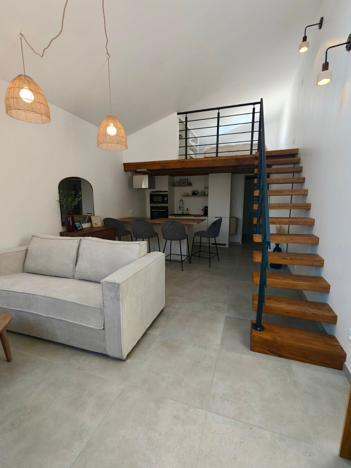 Դուպլեքս 30 մ2, որը կցված է սեփականատիրոջ տանը ՝ անկախ մուտք ։ Առաջին հարկ ՝ խոհանոցիկ(սառնարան, միկրոալիքային վառարան, մինի ջեռոց, գազօջախ, սրճեփ) ճաշասենյակ և բազմոց, ճոպանուղի ։ Հարկ ՝ 1 ննջասենյակ երկտեղանի մահճակալ (մանկական մահճակալի հնարավորություն, անվտանգ մուտք դեպի երեխա), լոգասենյակ ՝ ցնցուղով և կրկնակի ունայնությամբ ։ Բակ ՝ սեղանով և պարտեզի աթոռներով: Հեծանիվների և մոտոցիկլետների ապաստարան ։ Շուկան և խանութներ ՝ 100 մ հեռավորության վրա ։ Ոտքով մուտք դեպի նավակայան և Լա Կայենի ալիքը, ռեստորաններ, ոստրեների քաղաք ։ Հեծանվային զբոսանքներ