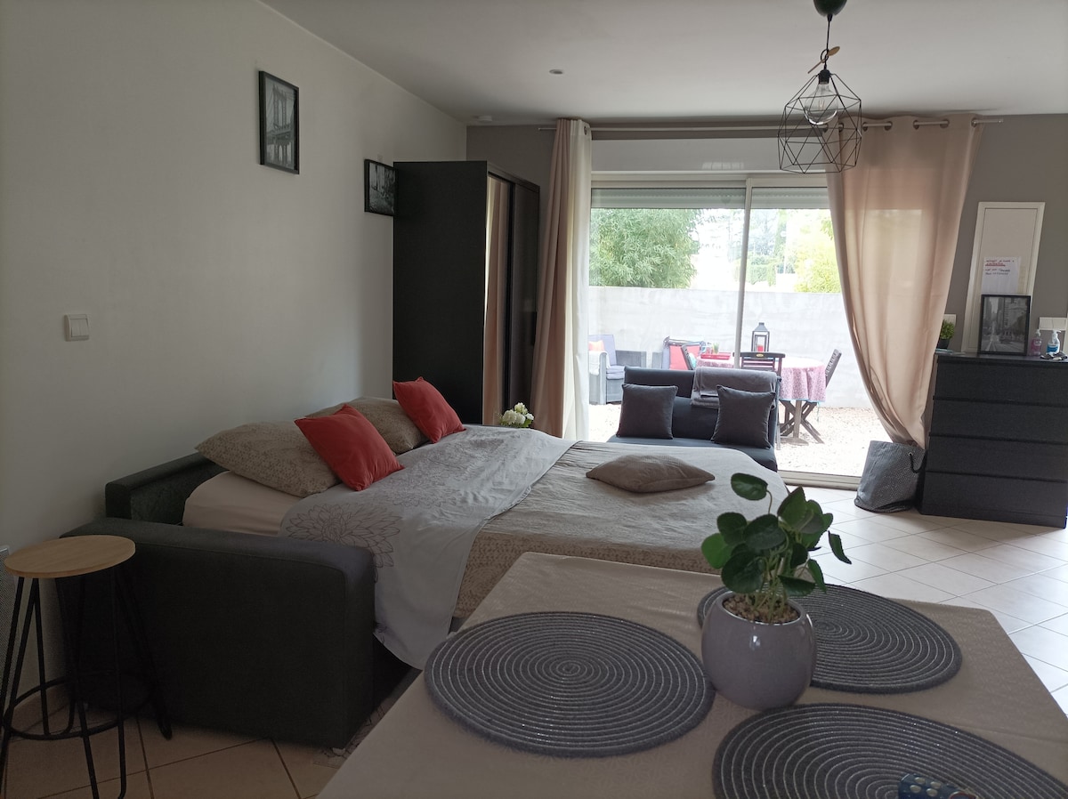 Feel@Home Nemausus ®- ն առաջարկում է️ ձեզ այս շքեղ⭐️⭐️⭐️⭐️, անկախ բնակարանը Nimes - ի ծայրամասերում (7 րոպե): Այն բաղկացած է ննջասենյակից ՝ Bultex®️ 150 -179 սմ մահճակալներով (160/200), հյուրասենյակից, որը բաց է լիովին կահավորված խոհանոցով և լոգարանով լոգասենյակով ։ Կինոթատրոնի տարբերակն ընտրվել է xxl էկրանով (75inches) 4K և Netflix հոսքային հեռարձակման ծառայության միջոցով:🎥🎞🍿 Դուք նաև ունեք 160 մ2 առանձին պարտեզ և մասնավոր կայանատեղի:🅿️