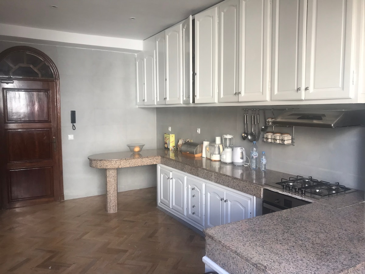 A beautiful fully renovated apartment on the 2nd floor (1st floor in french) of a well located villa, best location in the most beautiful residential area (Anfa/Ain Diab), at 200 meters from the "Corniche", with its own entrance, sun exposure with a big terrace, double living-room, one big bedroom, new kitchen & bathroom, homy feeling! wifi/cable, cleaning service included during your stay (except on week end)