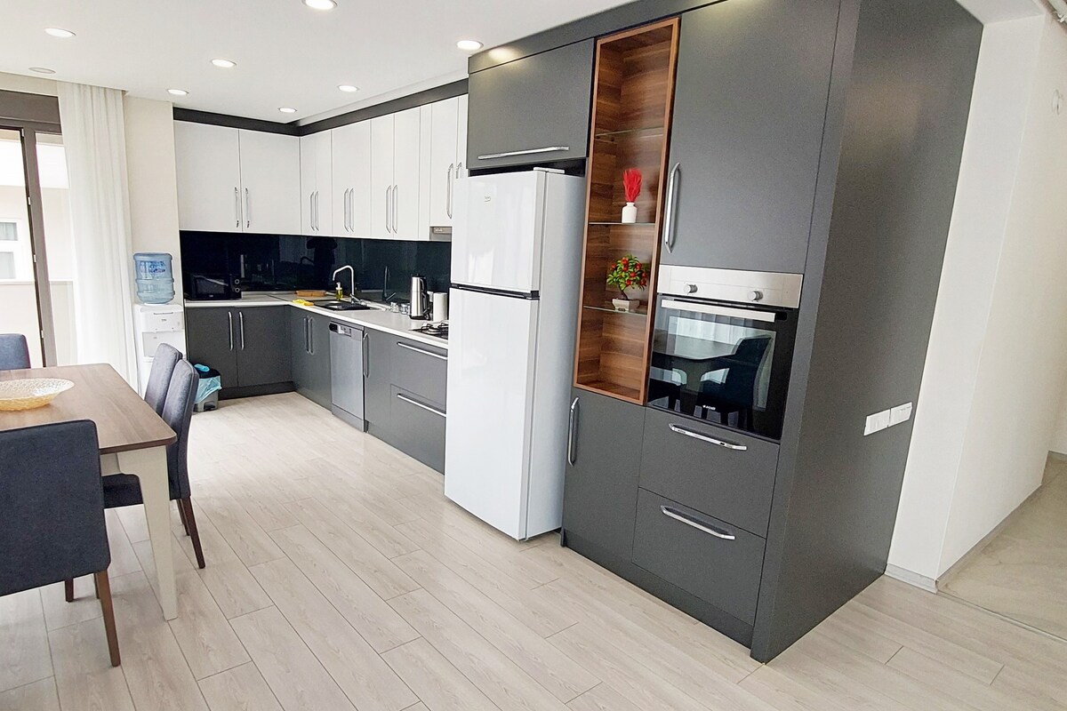 120 m2 modern, comfortable, luxurious apartment in the city center, equipped with all amenities. It offers views of the Old Town, the sea, and the Taurus Mountains. It's a 3-minute walk to the Old Town, a 10-minute walk to the marina, and a 10-minute walk to Mermerli Beach. Tram and bus stops are nearby. It's 100 meters from Hadrian's Gate, the entrance to the Old Town. It's 50 meters from the nostalgic tram stop. The metro station leading to the airport is 400 meters away.