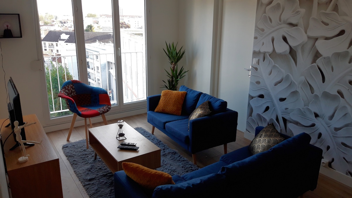 This charming F3 consists of 2 bedrooms. Sheets are provided and the bed will be made before your arrival. A very beautiful living space with equipped kitchen, Nespresso coffee machine, ceramic hotplates, oven, microwave. The bathroom consists of a shower, a vanity unit, a towel dryer, a washing machine. bath towels are provided. Also equipped with a live box 6 fiber optic connection. Perfect for business stays and exploring the city. - cathédrale 3min - Disneyland 1h10. - Paris, 45min by train
