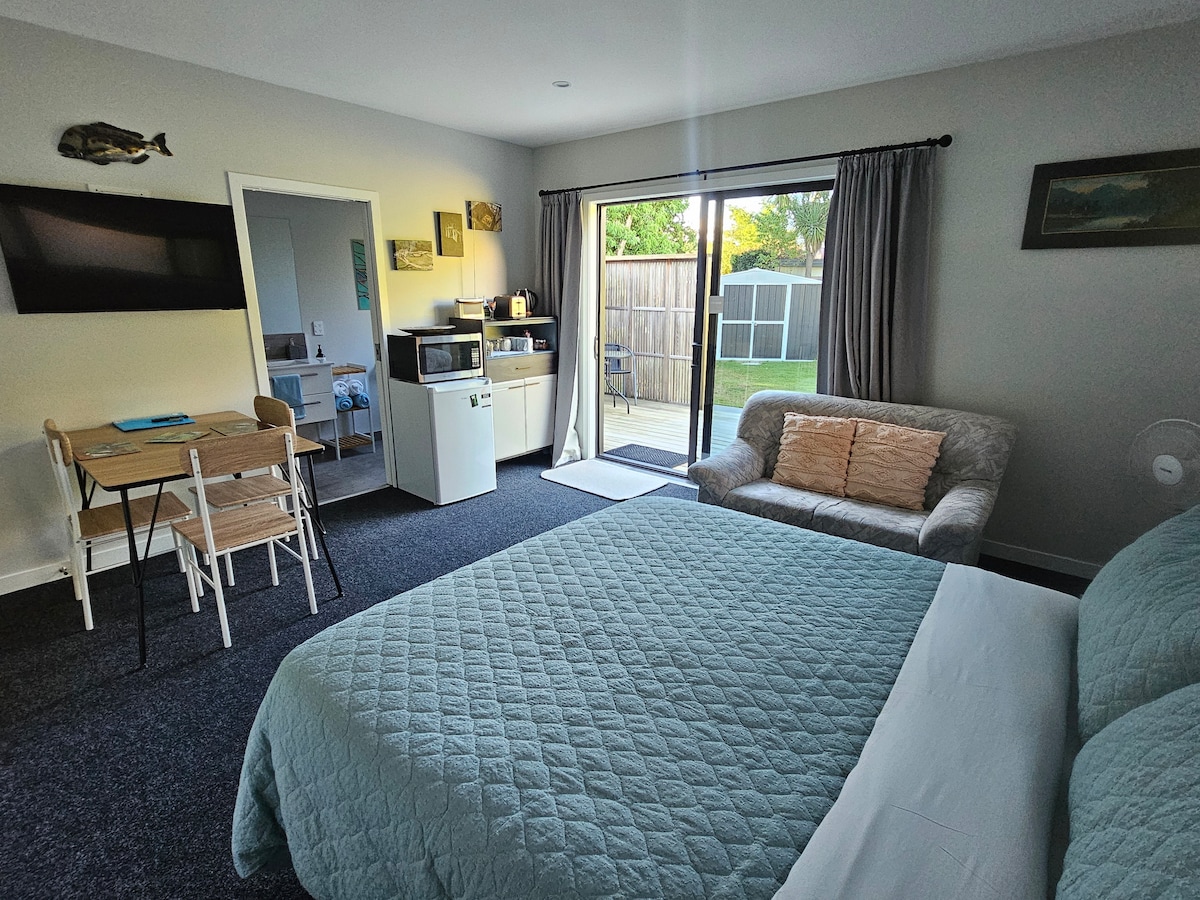 Take a break and unwind at this peaceful, spacious studio room with queen bed and en-suite. Sit on your private deck and listen for the native Tui that love the large "strawberry" trees, and watch the playful Piwakawaka (fantail) flitting from tree to tree. Enjoy a short walk to the beautiful clear waters of the lake, or the popular local bar/restaurant for some refreshments. There is a local (free) tennis court for a game of tennis or pickleball (racquets and paddles available on request)