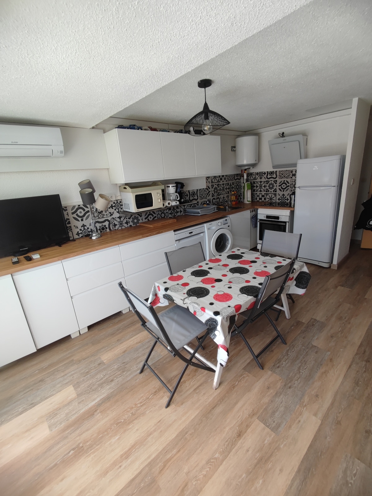 Լողափնյա բնակարան, փակ բնակելի տարածք ՝ առանձին կայանատեղիով Քուն 4 Ծովի փոքր տեսարանով տեռաս Այդ թվում ' 1 հիմնական սենյակ ՝ քնած 2 հոգով (140 x 190 կաշվե փոխարկելի բազմոց) 1 ննջասենյակ ՝ 2 ննջասենյակով (մահճակալ 140 x 190) 1 ցնցուղասենյակ ՝ ցնցուղով և լվացքի մեքենայով 1 առանձին WC ուղղակի մուտք դեպի լողափ, որը վերահսկվում է ամռանը գտնվում է մոտ 15 րոպե ոտքով դեպի խանութներ, ռեստորաններ, զվարճանքների այգի... Հեծանիվների ուղի, որը կանգնած է նստավայրի դիմաց երաշխիքային ավանդ 300 եվրո