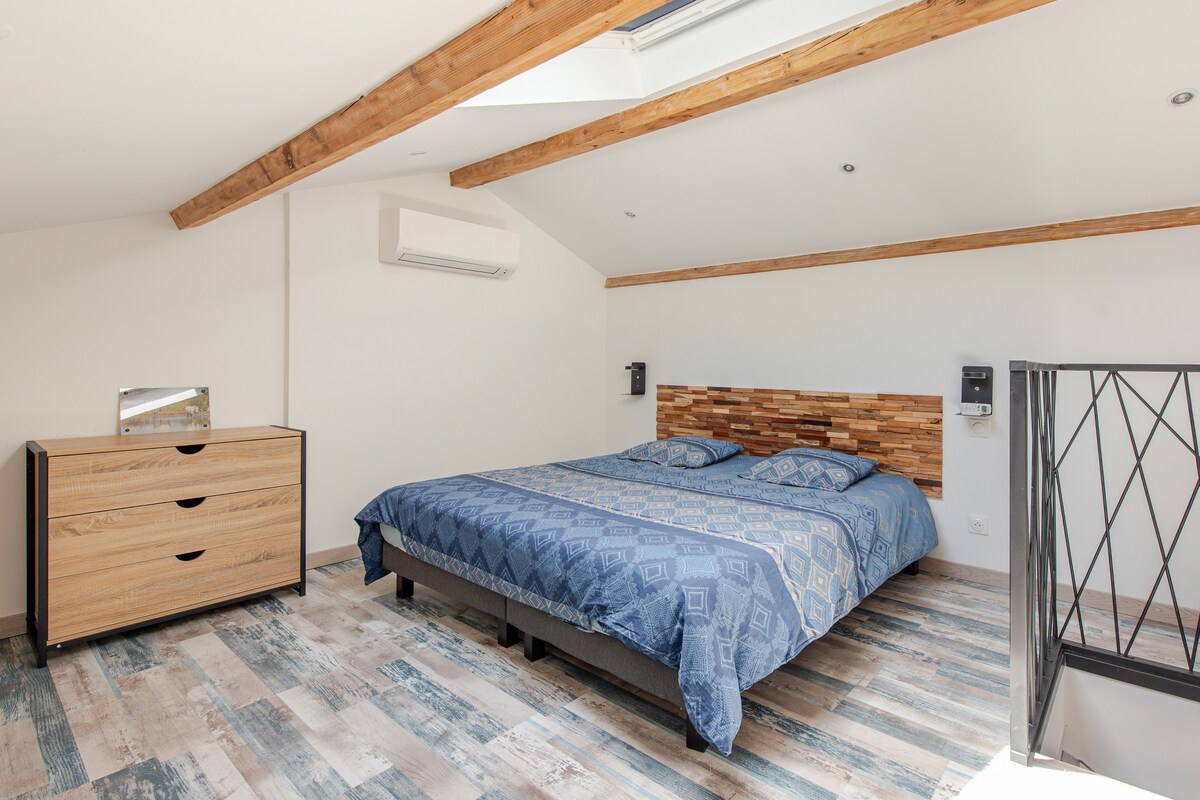 Completely renovated 65m² loft, offering a luxurious experience. The suite features a king-size bed (180x200) with ceiling mirror, a sumptuous bathroom with XXL walk-in shower and whirlpool bath, under a fiber-optic starry sky. The modern, fully-equipped kitchen opens onto a bright, spacious living room with XXL TV, home cinema and steam fireplace. This loft combines design, comfort and innovation, ideal for a romantic or professional stay in the heart of Marseille.