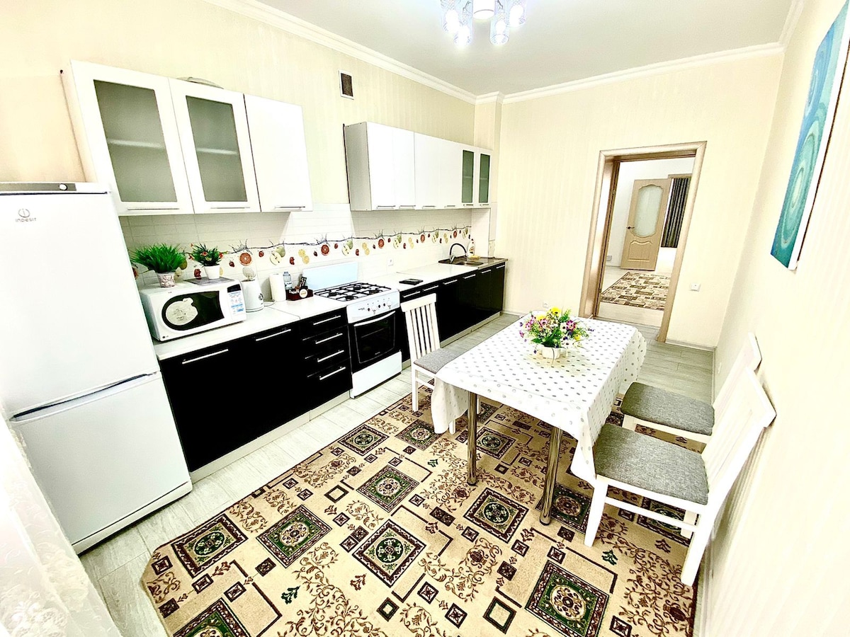 Апартаменты находятся в тихом и уютном районе города, в пешей доступности школа "Сымбат", спортивный центр «Жекпе-Жек», ледовый дворец, теннисный центр. К Вашим услугам апартаменты с гостиничным сервисом - отглаженные пастельные принадлежности, чистые махровые полотенца, одноразовые банные комплекты. В квартире есть все необходимое для Вашего комфортного проживания - бытовая техника, мебель, интернет Wi-Fi, кабельное телевидение, smart TV. Предоставляем все необходимые документы.