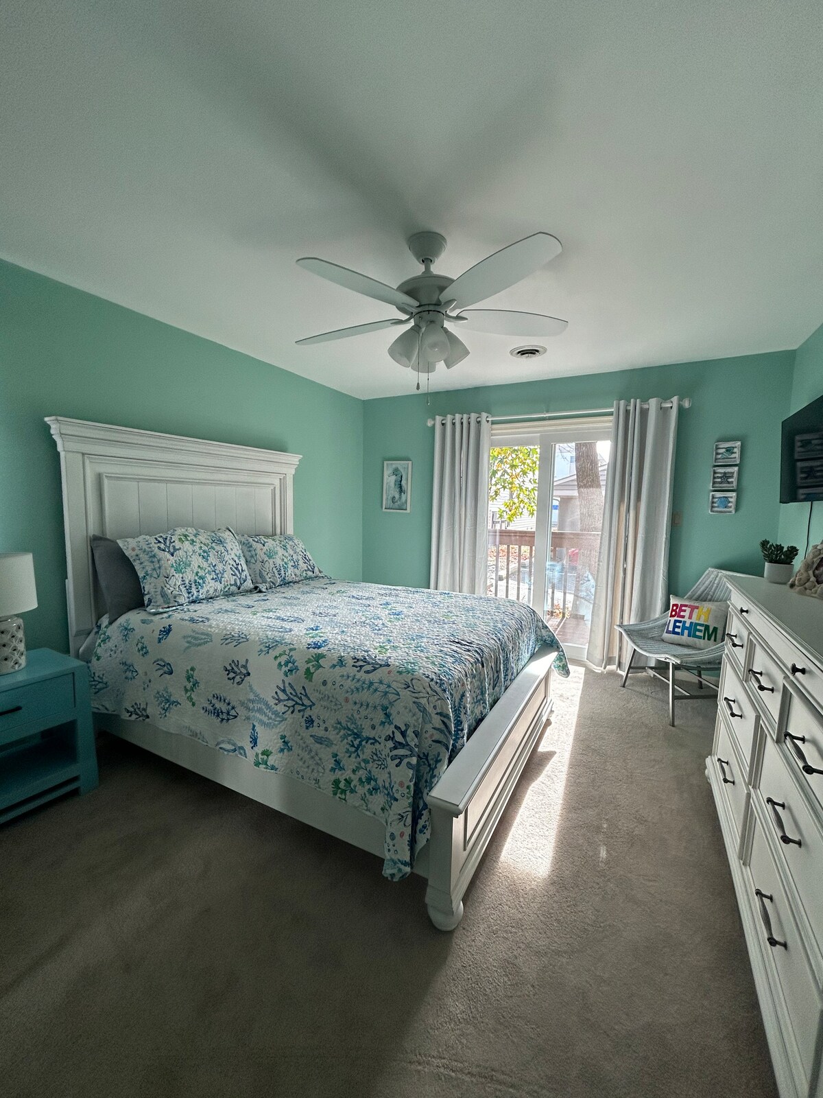 Unwind and chill in this boho coastal inspired guest suite on the ocean side. At Sea Dunes' private guest king suite, the surf and sand are steps away. Get ready to pack your cooler and enjoy a day in the sun on this beautiful, private dog-friendly beach. Sea Dunes is located in Fenwick Island, DE and nestled between protected state nature parks. Just a short trip in the car to a marina with watersports, kayak adventures on the bay, local dining, farm markets and shopping.