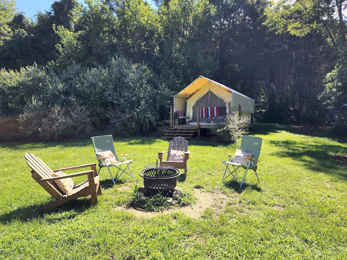 Camp under the stars at one of our private, outfitted campsites! Our canvas wall tent is all set up and ready for you to come and get away from it all. Drive right up to your site and enjoy the seclusion of 60 acres almost to yourself, with walking paths, creek access, and a campsite to make memories at. Whether you're looking perfect spot for a solo or couple's getaway, or a place for a family gathering, we would love to host you at Evensong Farm! No cleaning/service fees!