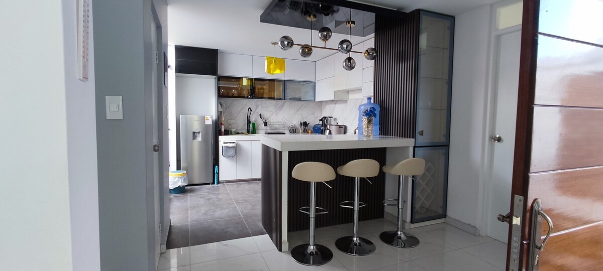 Departamento moderno y acogedor en barrio tranquilo, a solo 5 minutos de la playa. Cuenta con vista al mar, cocina equipada, WiFi rápido, TV en cada habitación, patio ideal para compartir, zona de lavandería y cochera. Entrada independiente y cámaras exteriores para mayor seguridad. Se aceptan mascotas pequeñas, previa coordinación. Ideal para disfrutar Mollendo con comodidad 🏖️✨