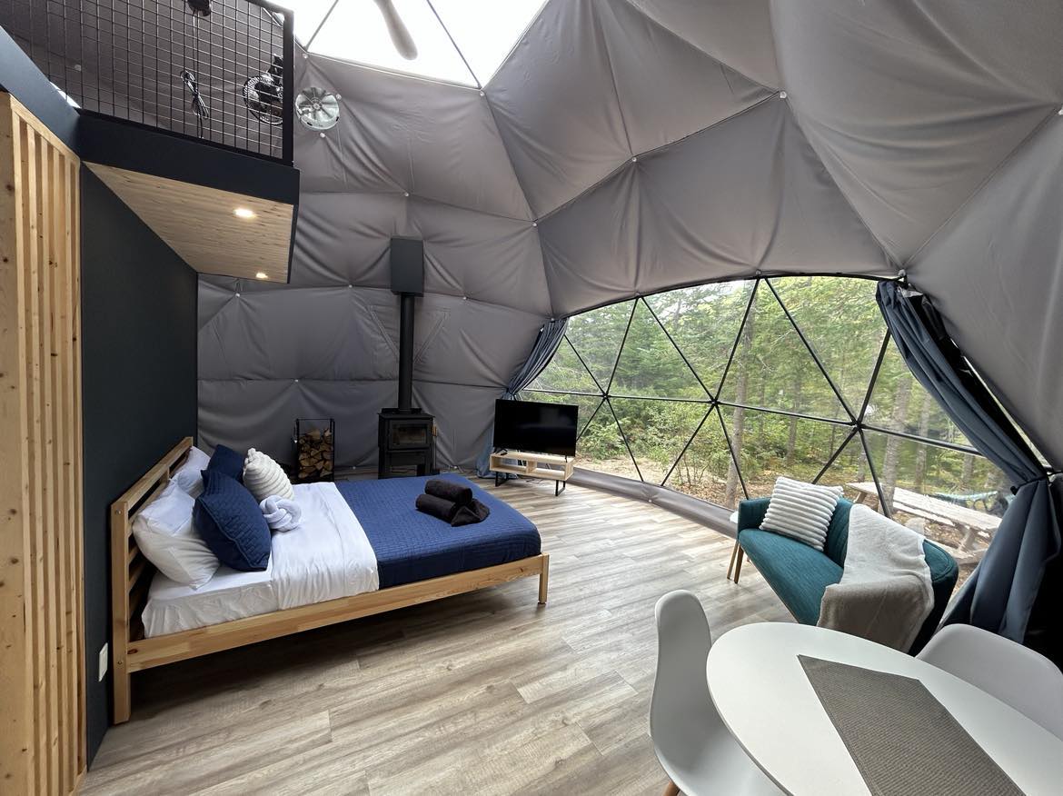 Visit our Airbnb profile to see the listings of our 6 private domes :) Welcome to Gîte l'Évasion! Experience sleeping under the stars in the comfort of a king bed, in the wonderful Lake Superior region. ✲ 25 minutes to Tremblant ✲ Private 4-season spa ✲ Indoor Gas Fireplace ✲ Fire pit ✲ Private terrace with BBQ ✲ Footpath ✲ Private shower ✲ Full kitchen ✲ AC ✲ Included: Bedding, towels, sanitary