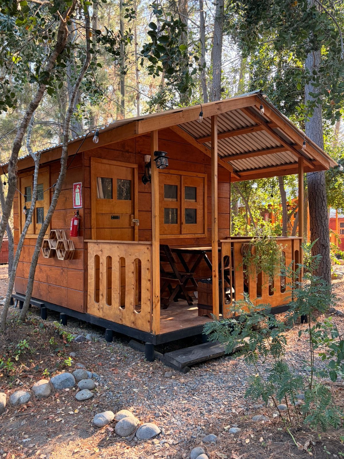 <b>Aviso Importante: las mini habitaciones NO tienen baño interior.</b> Los baños privados + duchas con agua caliente están a solo 30 m en zona exclusiva. Incluye: Excelente ubicación - habitación cerrada con camarote - velador y enchufes - Baño privado de uso exclusivo - Quincho, zona fumadores - Acceso directo al Río Claro - Wifi Starlink - Estacionamiento y cámaras de seguridad Glamping tranquilo en plena naturaleza.