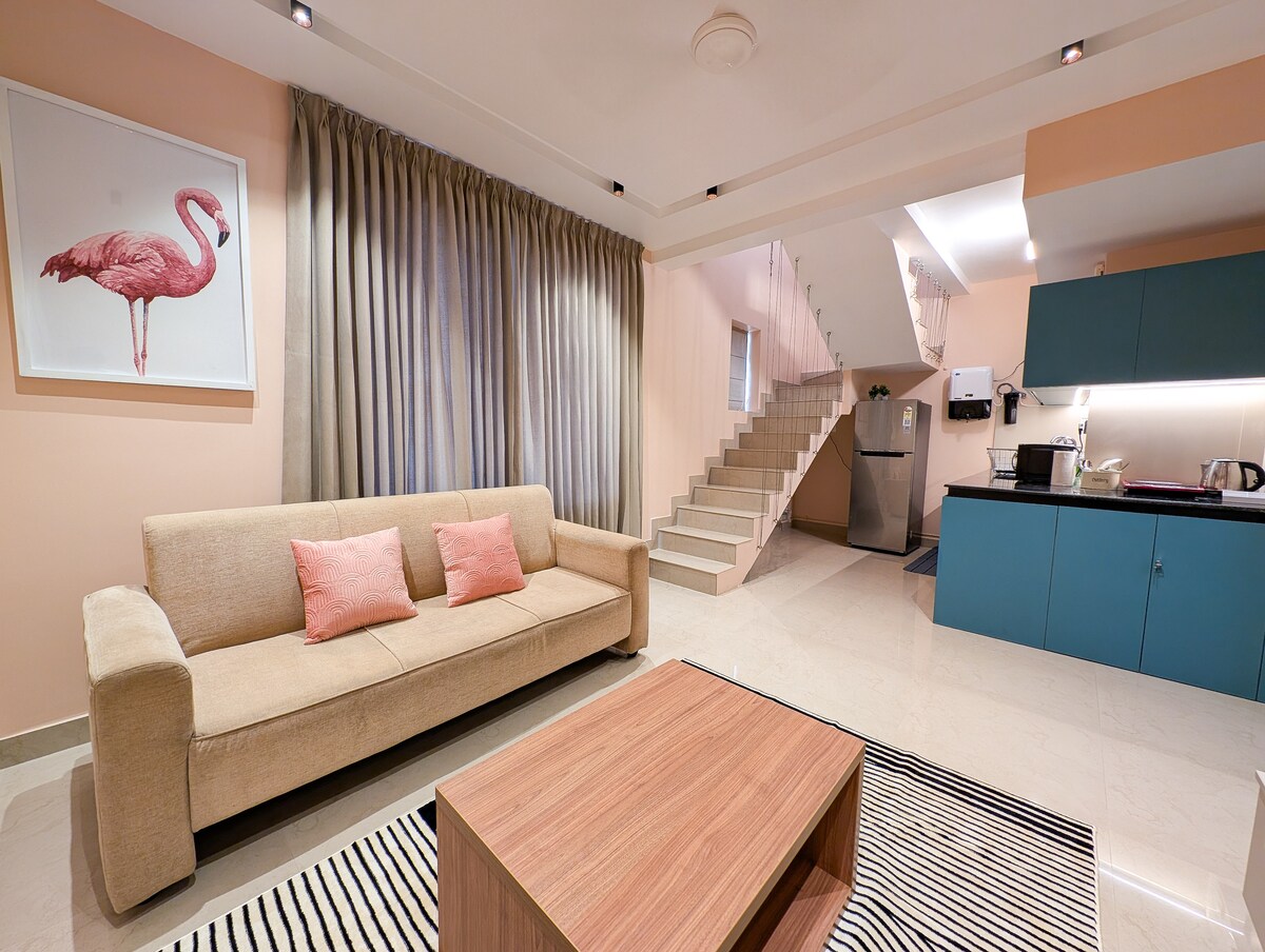 A stylish, sea-facing 1BHK duplex apartment on Calicut Beach at Seashells Apartments, offering a unique stay experience with modern interiors, and all the comforts of home. Enjoy: • A duplex layout with a dedicated bedroom upstairs and living space below • A cozy living area with a functional kitchenette, perfect for light cooking and relaxing • Contemporary furnishings with coastal charm throughout • Large windows that bring in natural light and offer beachside views