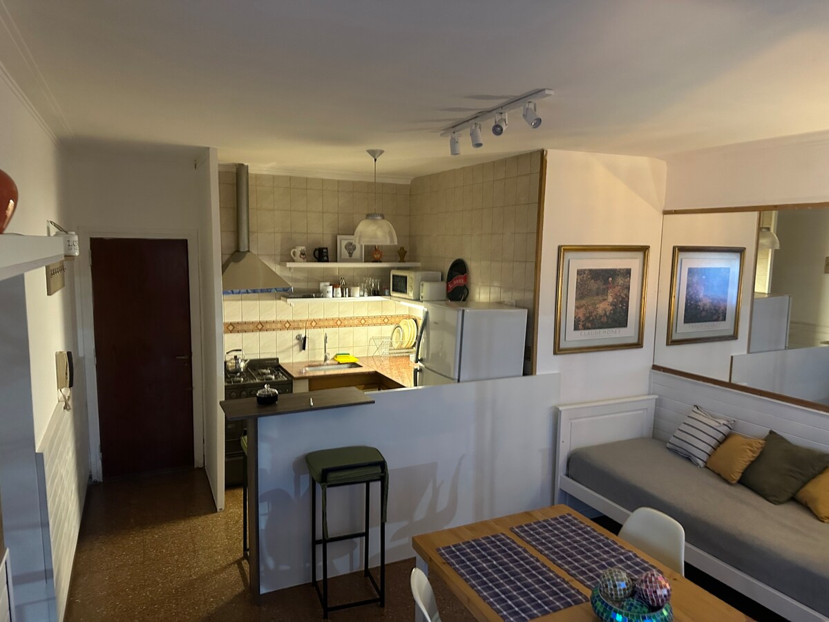 Ուրախ Monoambiente - ն իդեալական է մեկ կամ երկու հոգու համար ՝ կենտրոնական վայրում ։ Շատ պայծառ և հարմարավետ հանգիստ անցկացնելու առանձնահատկություններով ։ Այն ունի հեռուստացույց Led, Aire Acond, Սառցարան, Միկրոալիքային վառարան, Էլեկտրական սրճեփ, Anafe կրկնակի էլեկտրական ։ Sofá Cama. Ամբողջական սպասք, 2 սավան, 2 սրբիչ և սրբիչ