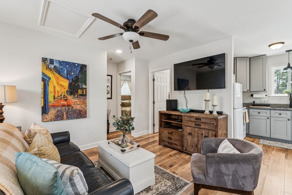 Perfect location, less than .3 miles from downtown Davidson /downtown Cornelius, this 2 bedroom above garage apt has it all! Spacious, bright, clean, well organized with fully stocked kitchen & W/D. Beautifully decorated & set up for convenient easy living. Located in a quiet, safe neighborhood. Enjoy a 5 min walk to a walking/bike trail on Lake Cornelius. Built October 2021 - this gorgeous guest house is located behind the main house, with a private entrance and your own back deck.