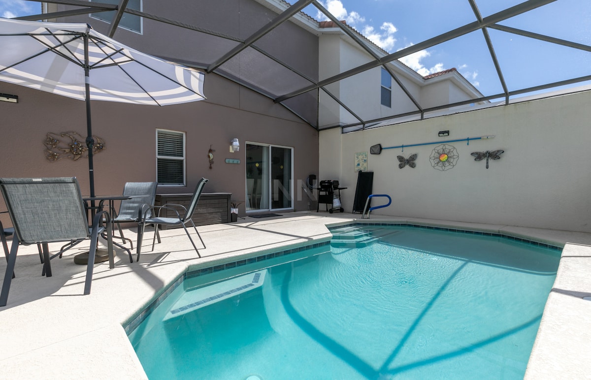 Welcome to our cozy townhouse, 20 minutes from Disney and 25 minutes from Universal. Right across the street, you will find the Medieval Times Dinner Show. This spacious townhouse offers 4 be/3 ba, comfortably accommodating up to 10 guests. The fully equipped kitchen includes appliances, cookware, and utensils for your convenience. Step outside to our private pool area, complete with brand new colorful furniture, where kids can soak up Florida's sunny weather