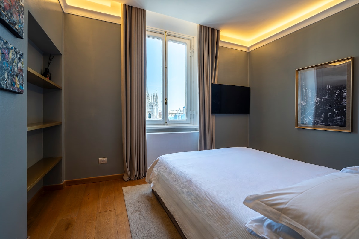 Welcome to our charming DUOMO-front suite, a magical place designed to offer you a special experience in the vibrant heart of the city. As soon as you step outside the suite, you will find yourself immersed in the magic of the historic center: cafés, boutiques, restaurants, and the wonders of Milan are all just a few steps away. But the most special moment will always be returning here, opening the windows, and admiring the illuminated Duomo right in front of you.
