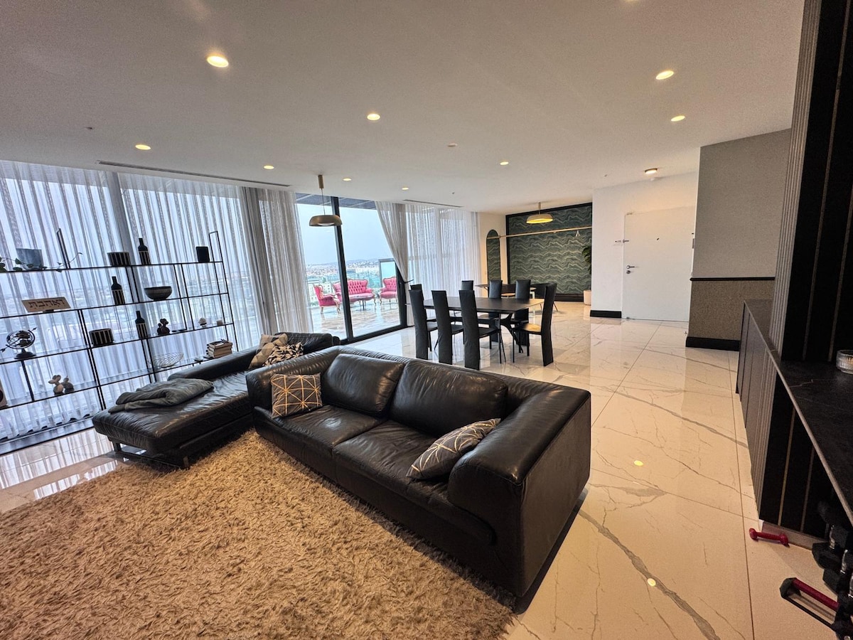 להתעורר מעל העננים. פנטהאוז בסטנדרט בינלאומי המציע חווית אירוח נדירה. הסלון העצום עטוף חלונות ענק, ולרשותכם שתי מרפסות מפנקות לקפה של בוקר או יין מול השקיעה. חדר השינה הוא יצירת מופת אדריכלית עם תקרות גבוהות וקירות זכוכית שפשוט מכניסים את הנוף למיטה. השילוב המושלם בין פאר, שקט ומיקום מרכזי מנצח.