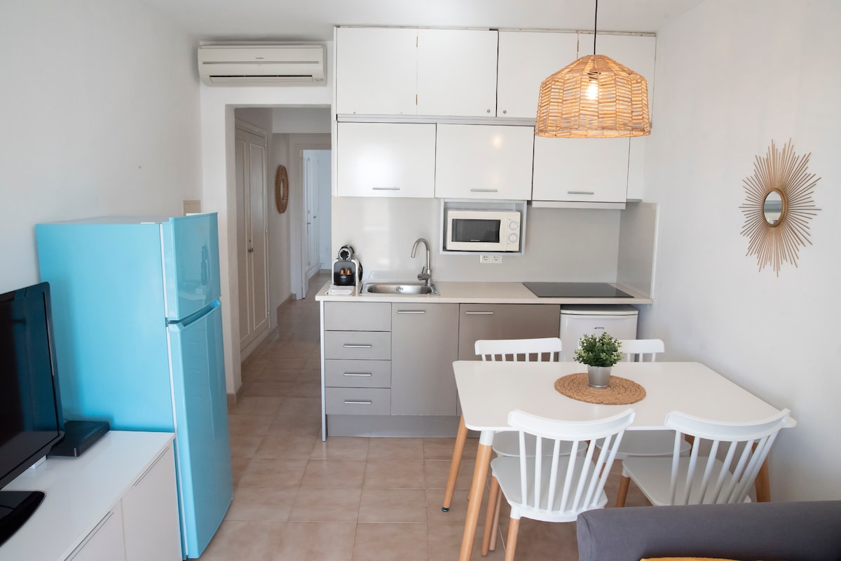 Apartamento totalmente reformado de estilo marinero, en primera línea y con vistas al mar. Frente al faro del Cap d´Artruxt donde hay las mejores puestas de sol de la isla. Situado en primera planta con un entorno tranquilo y acogedor, con zonas enjardinadas de 2.500 m2 y piscina comunitaria con vistas al mar y al faro, ideal para parejas y familias con niños. Apartamento equipado con aire ac., lavaplatos, TV, wifi, nevera, microondas, lavadora, nespresso, cuna y silla bebe.