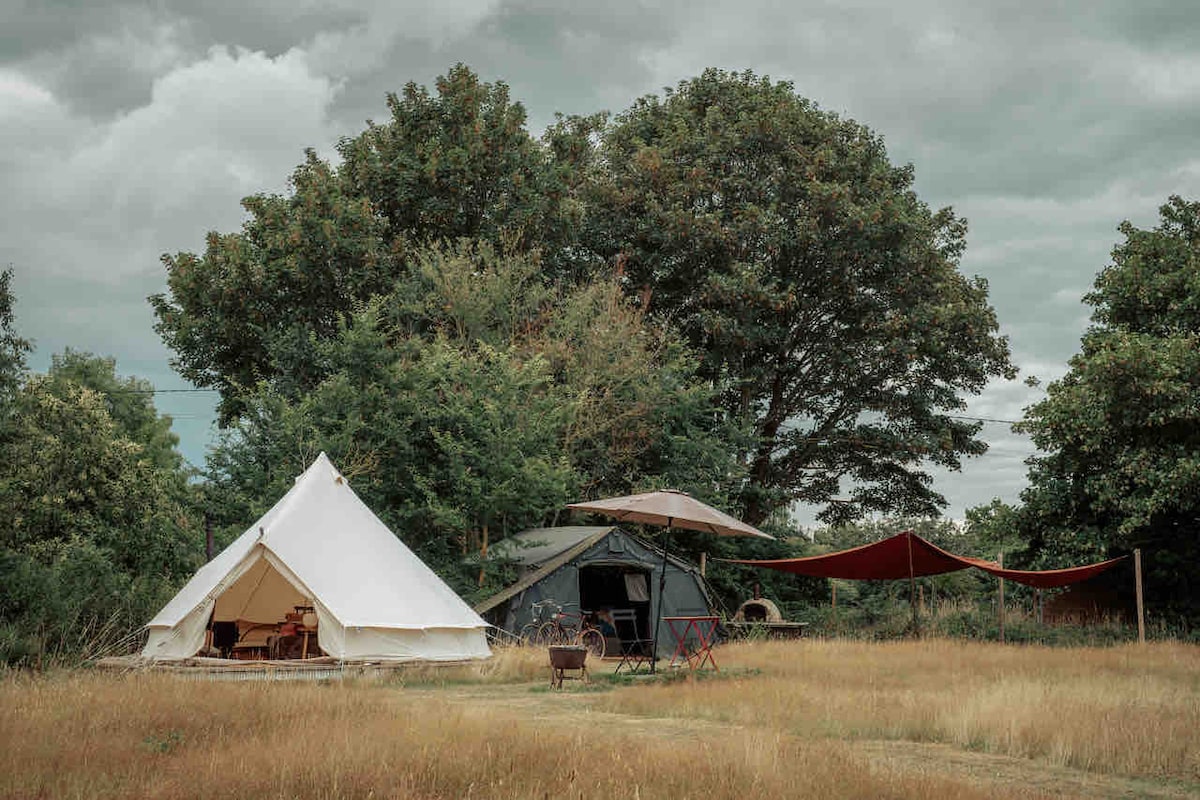 Այստեղ ՝ Suffolk Steel House - ում և Glamping - ում, մենք ունենք երկու շքեղ 5 մետր բարձրությամբ զանգի վրաններ, որոնք կարող եք վայելել: Վրանները տեղադրված են ավելի քան 1/2 ակր, որը գտնվում է Սաֆոլկի ծայրամասում, որպեսզի դուք վայելեք: Դուք կկարողանաք օգտվել ընդհանուր արտասովոր վինտաժային Rice Horsebox խոհանոցից, ինչպես նաև ձեր սեփական «Մոնտի Դոնի» ոգեշնչված ծալքավոր պողպատից թափված լոգասենյակից, որտեղ կգտնեք տաք և սառը հոսող ջուր, ինչպես նաև կլվացող հեղուկներ: