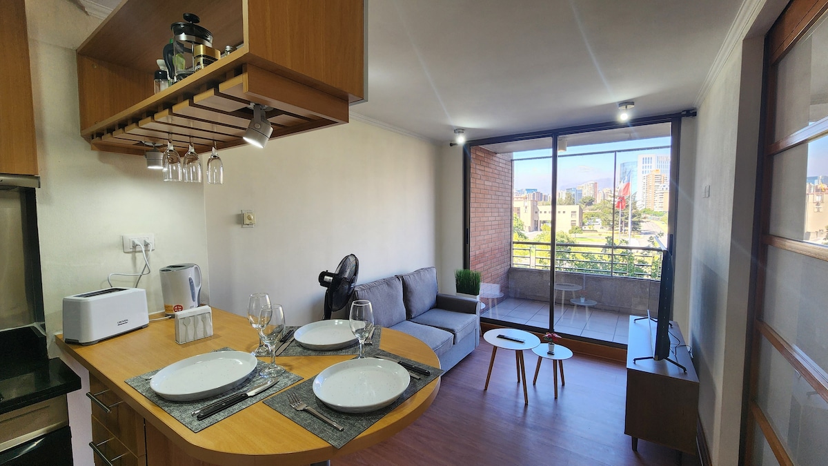 Մեկ ննջասենյակ, մեկ լոգասենյակով բնակարան ՝ երկտեղանի մահճակալով և հյուրասենյակում բազմոցով ։ Ունի շարժական օդորակիչ: Կայանատեղը ներառված է գնի մեջ: Լաս Կոնդեսի լավագույն վայրում ՝ Escuela Militar մետրոյի ելքի մոտ, մոտակայքում կան ռեստորաններ և առևտրի կենտրոններ, Գտնվում է Mall Costanera Center - ի և Parque Arauco Mall - ի միջև ՝ յուրաքանչյուրից 8 րոպե հեռավորության վրա ։ Շենքն ունի վերանորոգված մարզադահլիճ