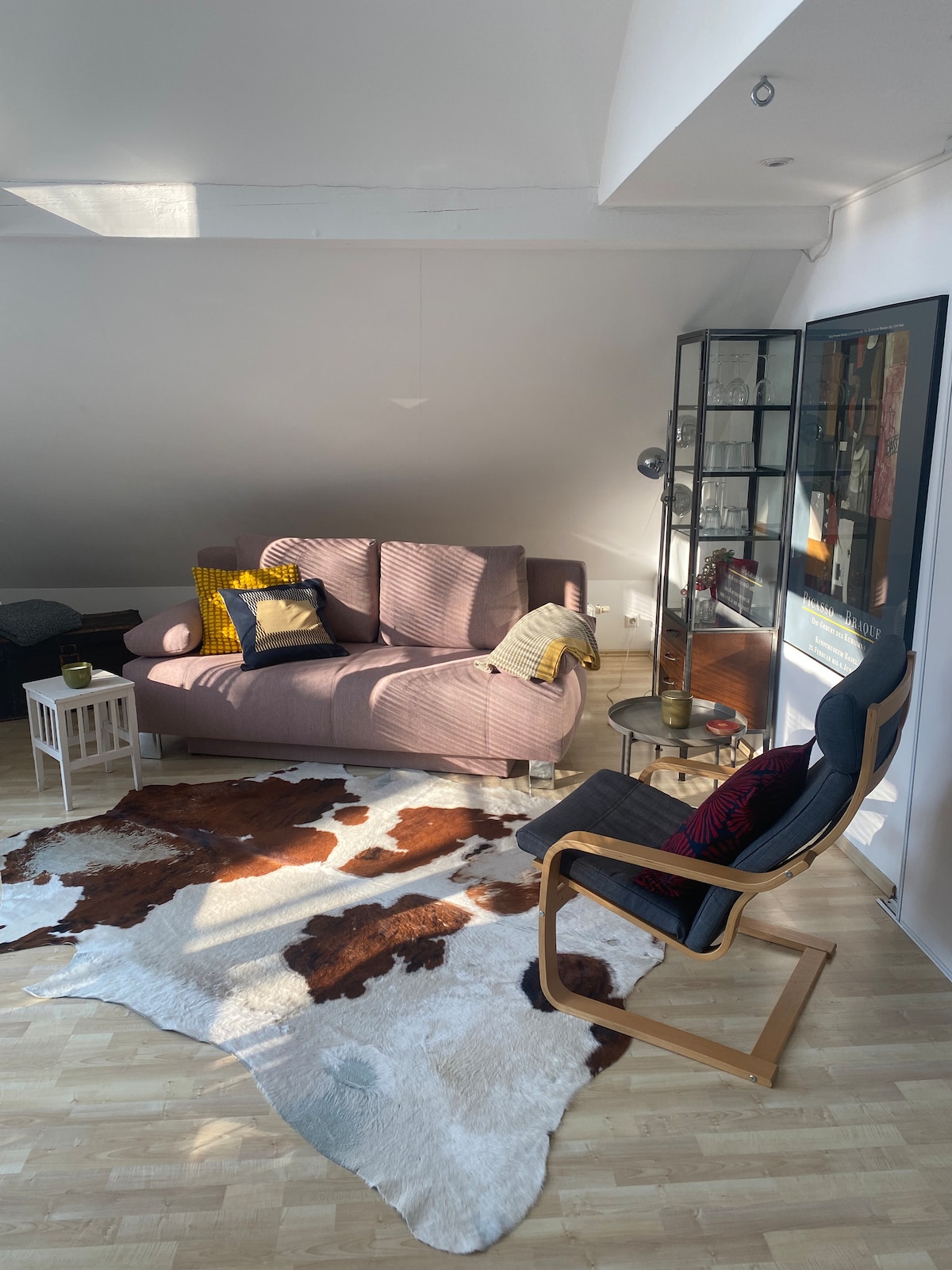 Մենք վարձակալում ենք ժամանակակից, լուսավոր, 60 քմ բնակարան քաղաքի հովվերգական ծայրամասում: Խոհանոցը լիովին կահավորված է, և առավոտյան սուրճի համար այգին, որն անմիջապես անտառին կից նստած է, հրավիրում է ձեզ վայելելու առավոտյան սուրճը ։ Բացի այդ, մեծ ցնցուղից երբեմն կարող եք անտառում եղջերու դիտել ։ Ննջասենյակը հյուրասենյակից և ճաշասենյակից առանձնացված է սահող դռնով ։ Առջևի մեծ պատուհանից բացվում է գեղեցիկ տեսարան դեպի քաղաքի կենտրոն ։