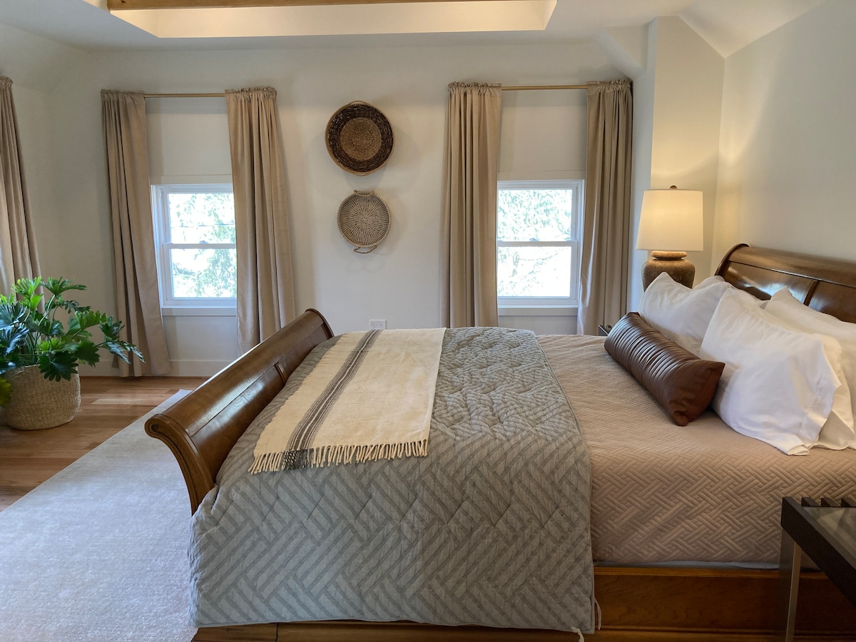 Come stay at our 1860's totally updated farmhouse, centrally located in the heart of Michigan Wine country and 7 minutes to Weko Beach! Fenced yard for dogs, Spacious, stylish and comfortable, with an expansive kitchen, home gym and 3 huge bedrooms, 2 en-suites. We lovingly brought this pre-Civil War farmhouse back to life and added every comfort. Heated tile floors throughout, designer finishes and a beautiful farm setting with room to roam and relax.