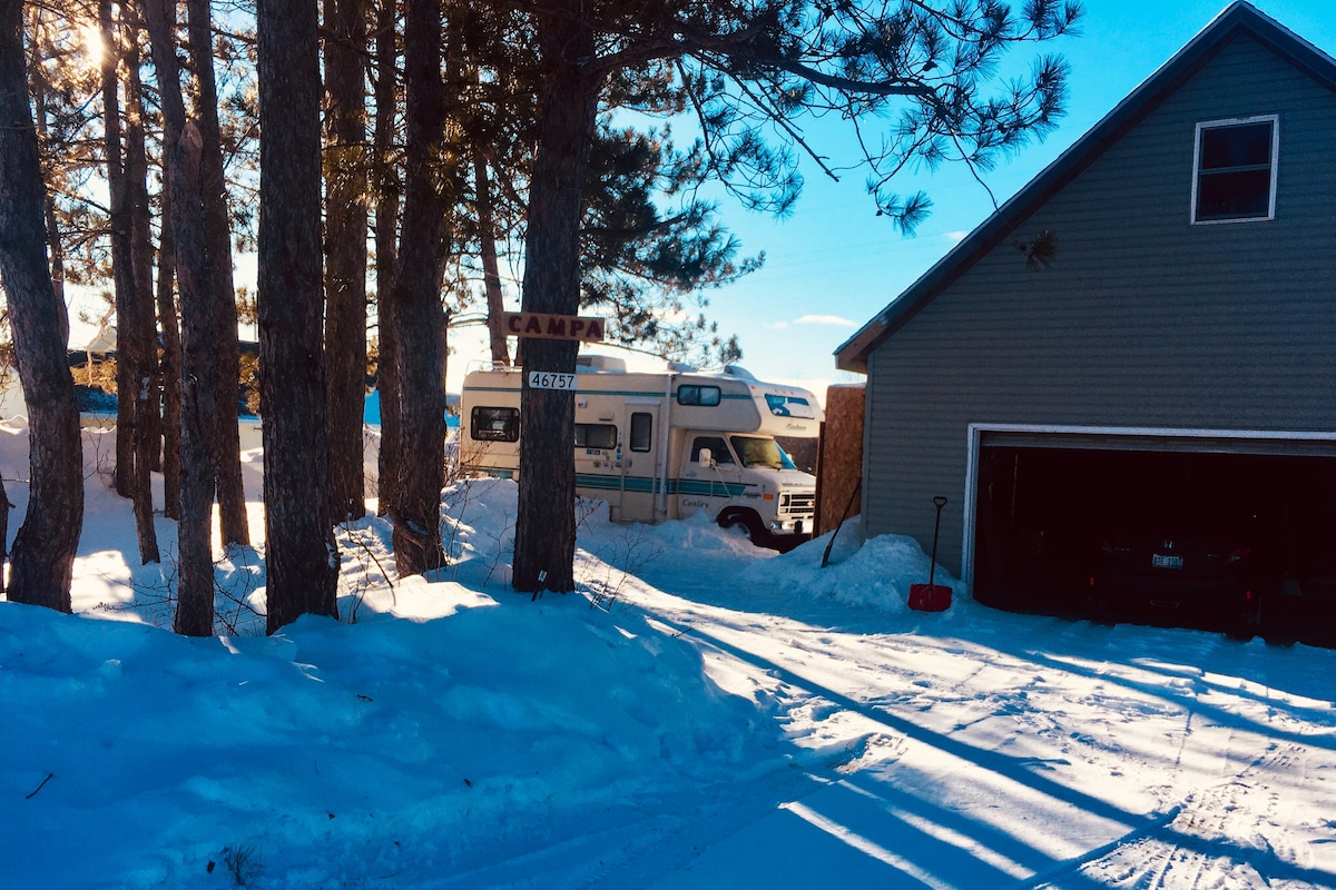 Որտեղ զբոսաշրջությունը համապատասխանում է բնությանը: Վայելեք Հյուսիսային Միչիգանի մասնավոր ճամբարը 36 ֆուտանոց ճամփորդական հոլովակում ՝ բունկհաուսով և բացօթյա խոհանոցով, որը գտնվում է գեղեցիկ անտառապատ կայանատեղիում ։ Ձեզ անհրաժեշտ ամեն ինչ ապահովված է: Այս մասնավոր քեմփինգը, որը գտնվում է Չեբոյգանի ներքին ջրային ուղիներից, պատմական Մաքինավ Սիթիից, Մաքինավ կղզու լաստանավերից 10 րոպե հեռավորության վրա ։ Եկեք և ականատես եղեք Հյուսիսային լույսերին և վայելեք ձեր սեփական մութ երկինքը ՝ զբաղված քաղաքից մի քանի րոպե հեռավորության վրա: Հյուսիսային Մեքսիկայի ձեր արձակուրդը սկսվում է այստեղից ։