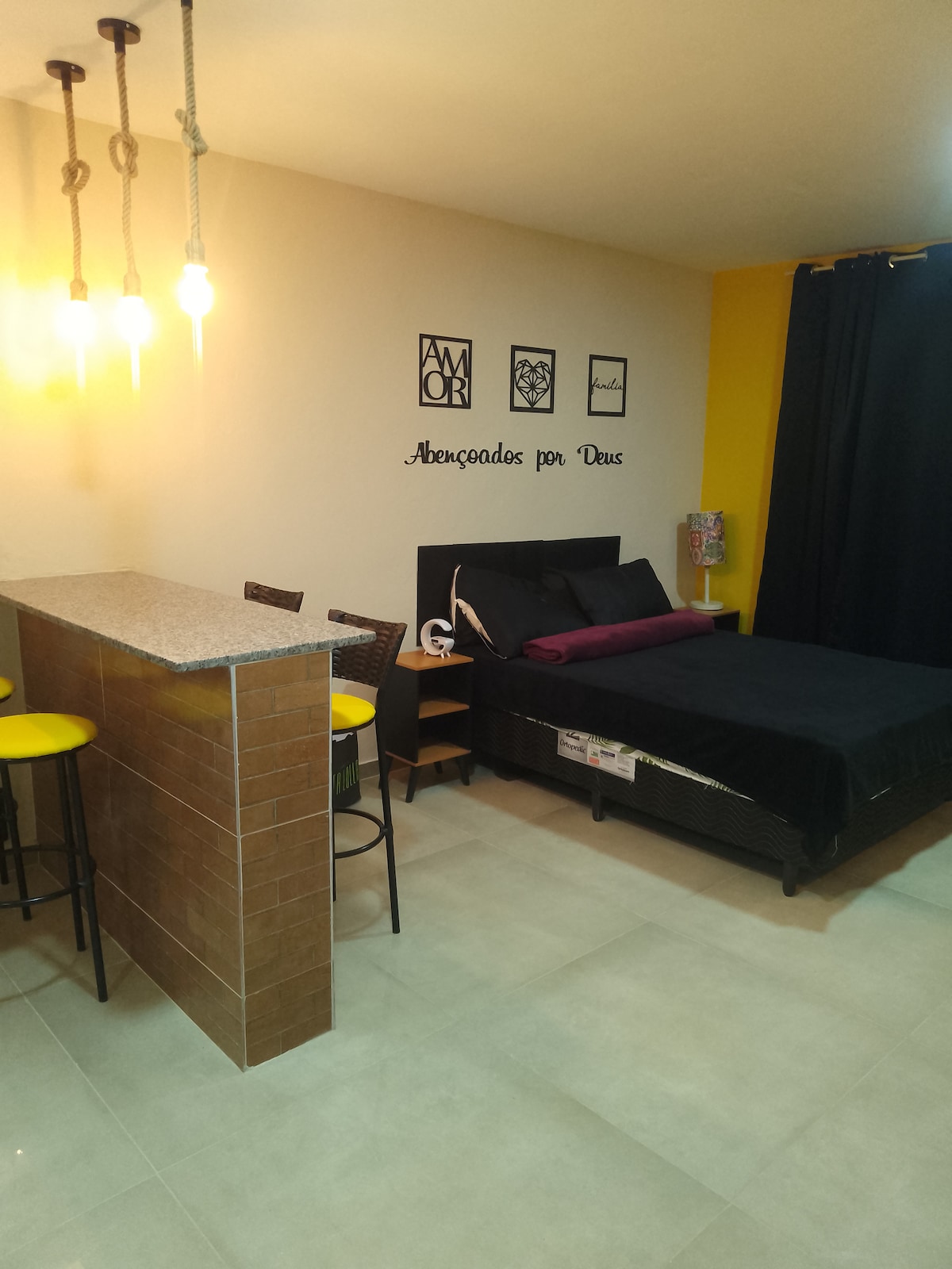 Studio sossegado e muito cheio de estilo em residencial tranquilo. Bairro seguro, totalmente residencial, em rua sem saída. Possuí cama de casal, TV Smart, ar condicionado, fogão, micro-ondas, geladeira, máquina de lavar, roupas de cama, banho e cozinha equipada. Experimente uma rotina diferente, venha se hospedar conosco! *Outras observações* Stúdio não possui vaga de garagem, mas é possível parar na rua, em frente ao condomínio.